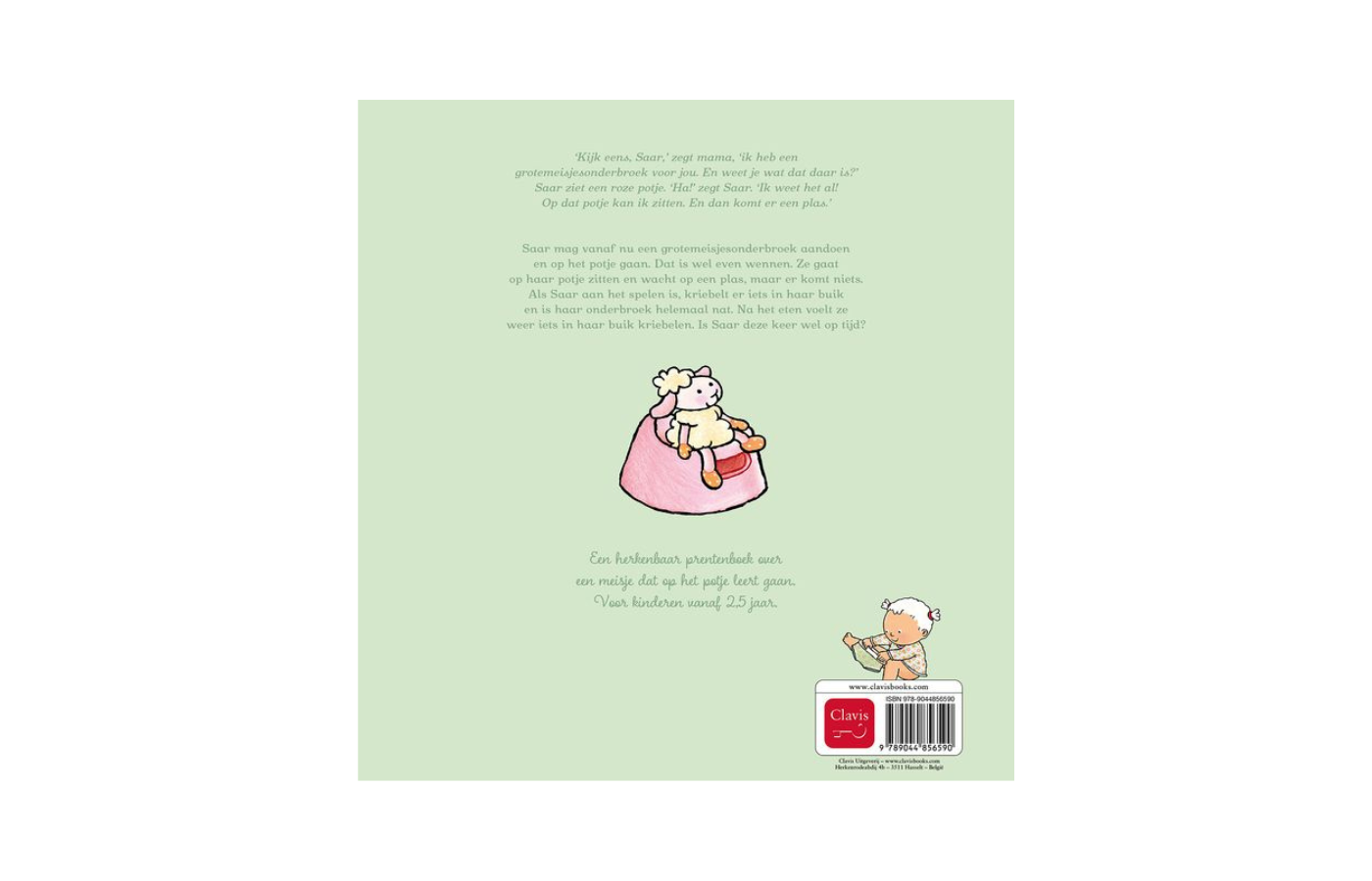 ‘Kijk eens, Saar,’ zegt mama, ‘ik heb een grotemeisjesonderbroek voor jou. En weet je wat dat daar is?’ Saar ziet een roze potje. ‘Ha!’ zegt Saar. ‘Ik weet het al! Op dat potje kan ik zitten. En dan komt er een plas.’ Saar mag vanaf nu een grotemeisjesonderbroek aandoen en op het potje gaan. Dat is wel even wennen. Ze gaat op haar potje zitten en wacht op een plas, maar er komt niets. Als Saar aan het spelen is, kriebelt er iets in haar buik en is haar onderbroek helemaal nat. Na het eten voelt ze weer iets in haar buik kriebelen. Is Saar deze keer wel op tijd? Een herkenbaar prentenboek over een meisje dat op het potje leert gaan.