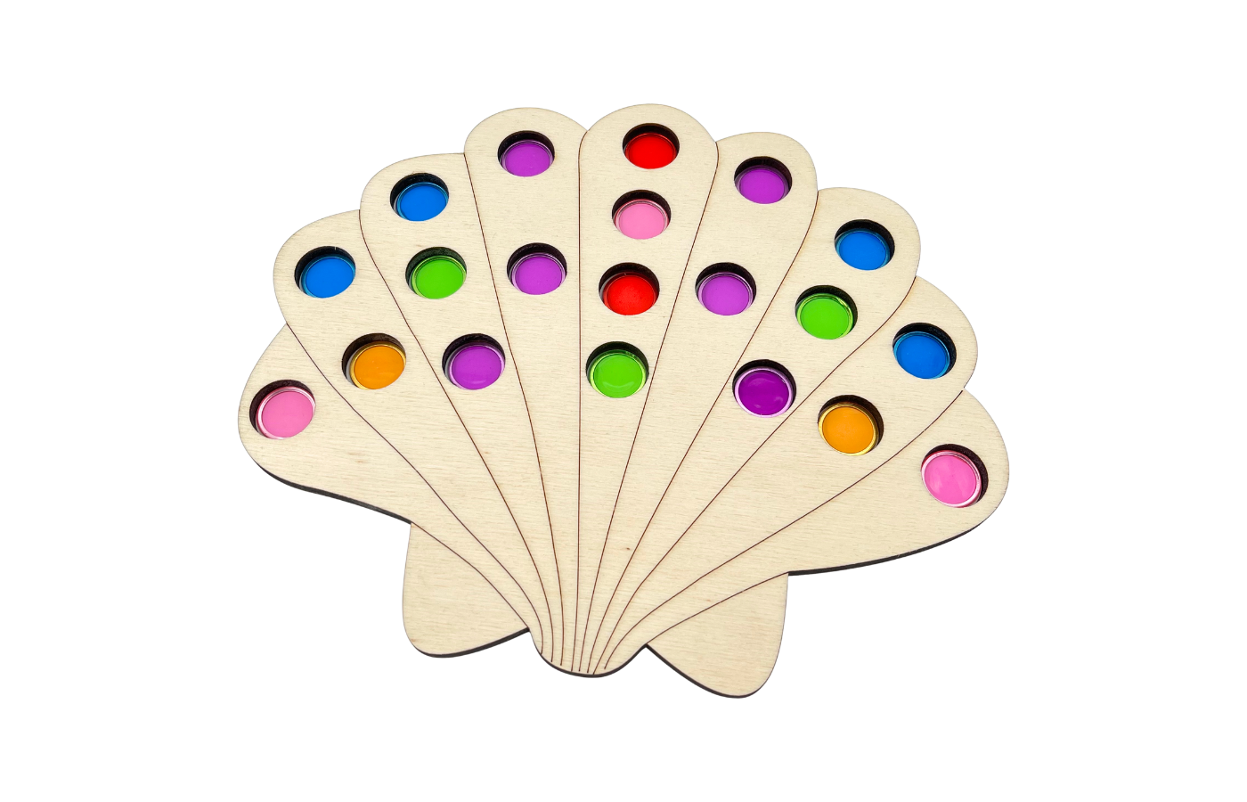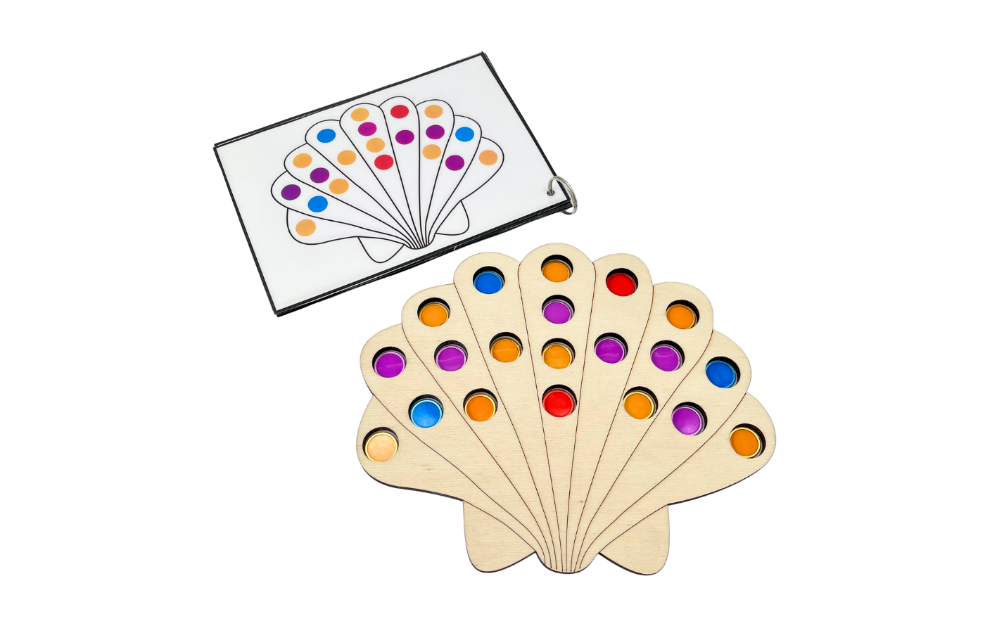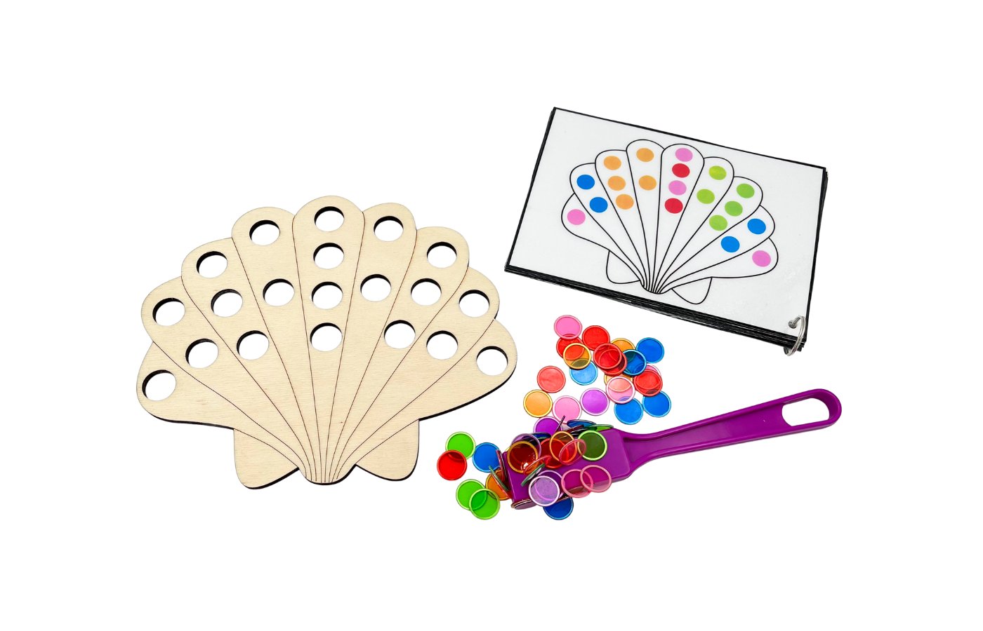 Fijnmotorisch spel met betrekking op ruimtelijke oriëntatie en rekenen. De kinderen leggen de magneetfiches in de gaatjes van de schelp op basis van een opdrachtkaart. Met de magneetstok kunnen de kinderen de fiches op een leuke manier van het spelbord halen.