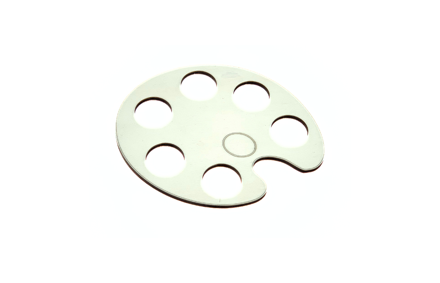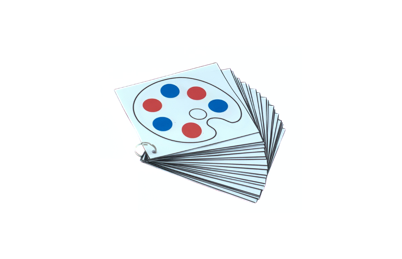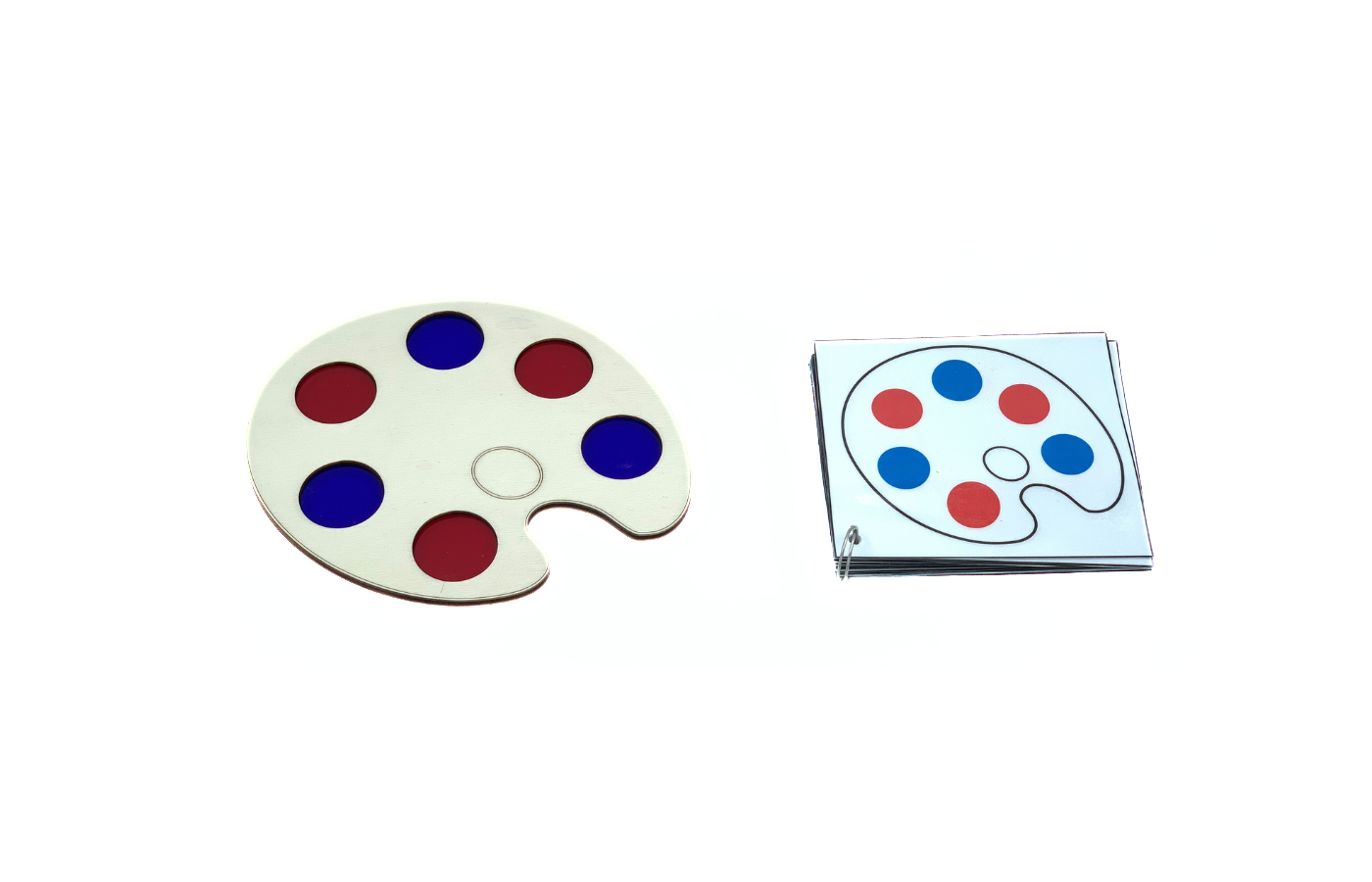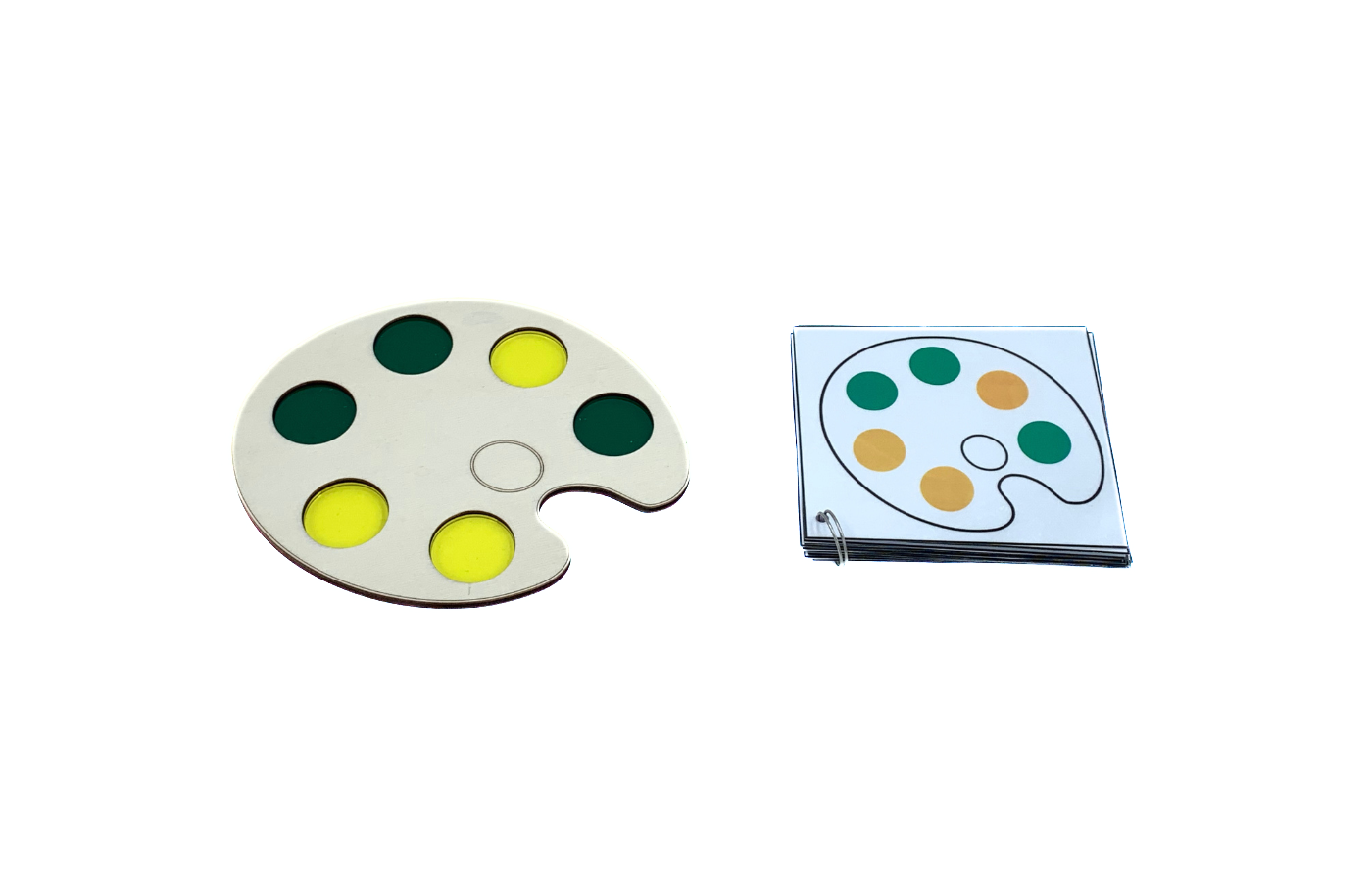 Fijnmotorisch spel met betrekking op ruimtelijke oriëntatie. Welke verf heeft de schilder op zijn palet? Geef de schilder de juiste kleuren (acrylvormen) zodat hij aan de slag kan gaan.