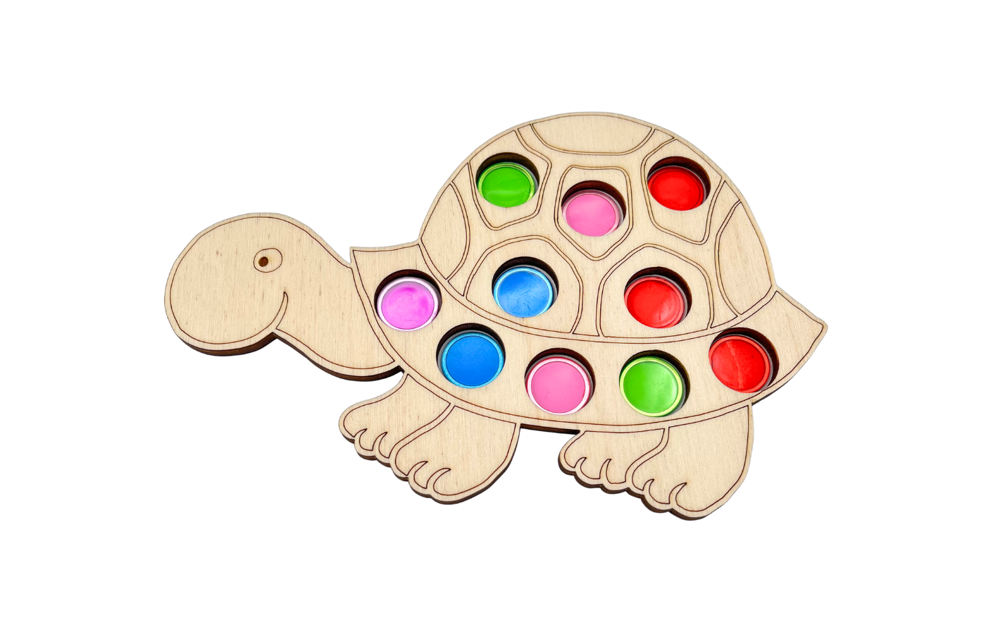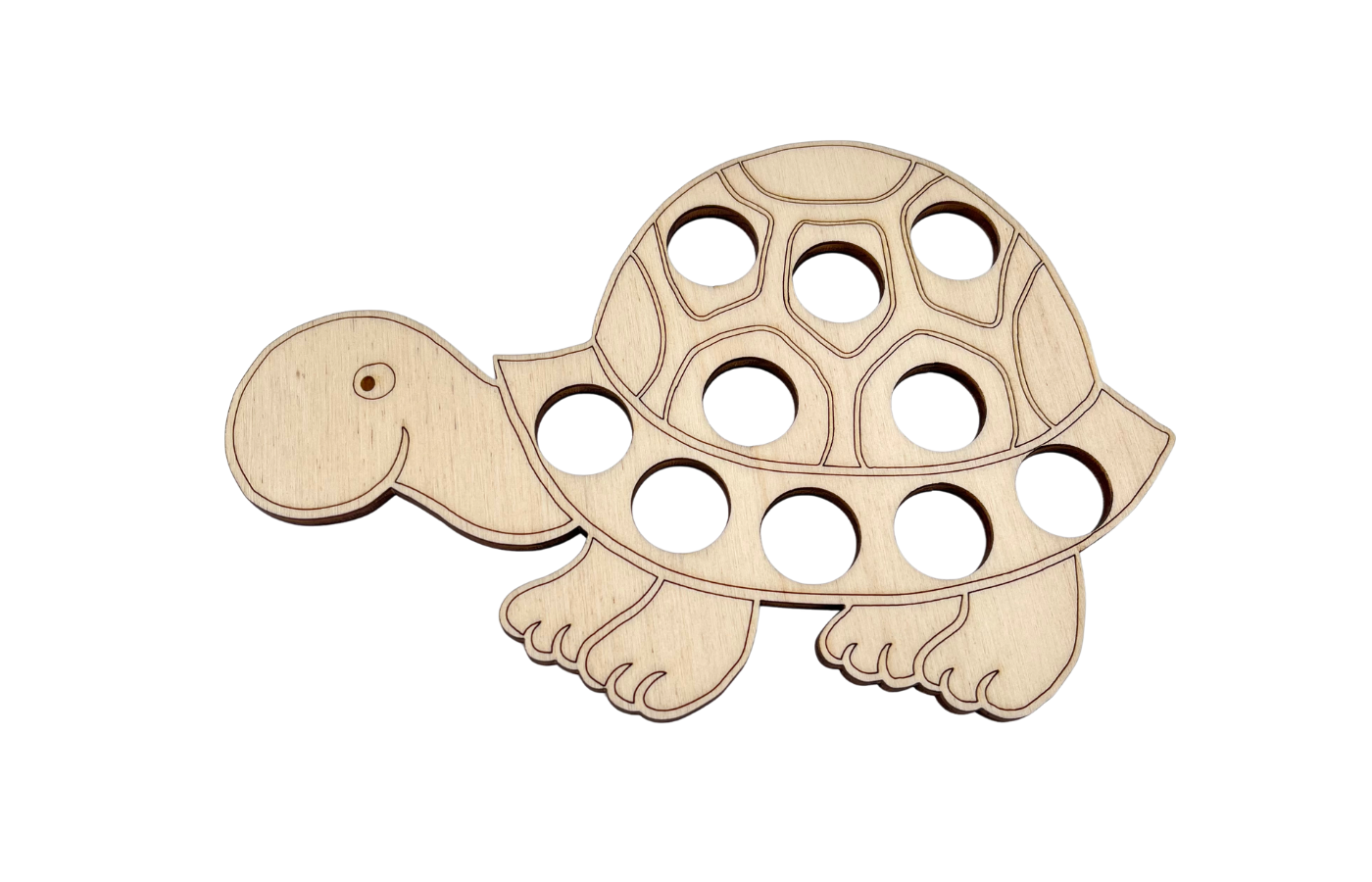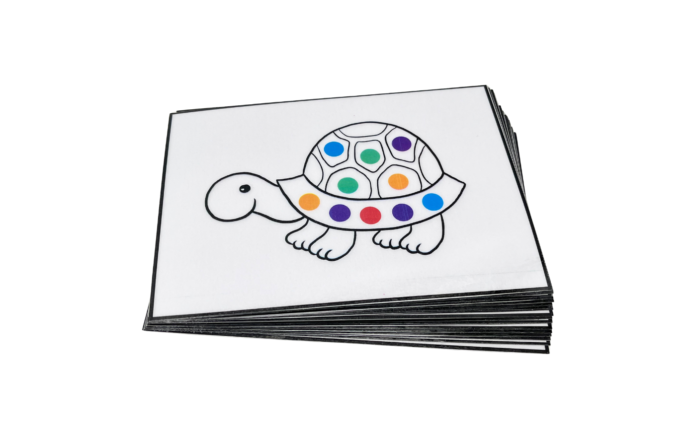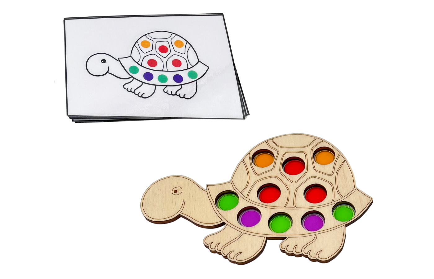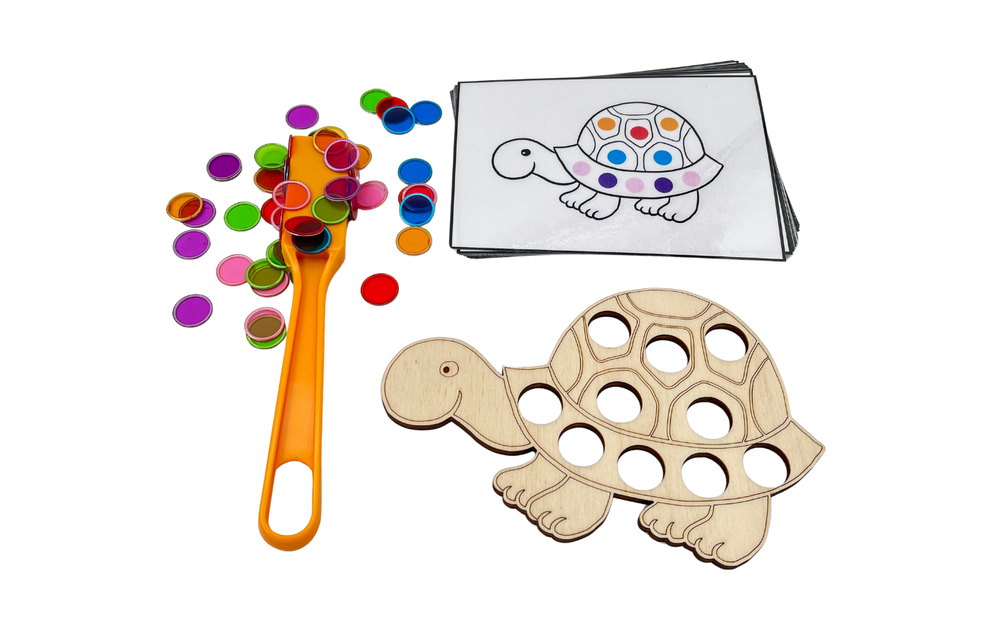 Fijnmotorisch spel met betrekking op ruimtelijke oriëntatie. De kinderen leggen de magneetfiches in de gaatjes van de schildpad op basis van een opdrachtkaart. Met de magneetstok kunnen de kinderen de fiches op een leuke manier van het spelbord halen.