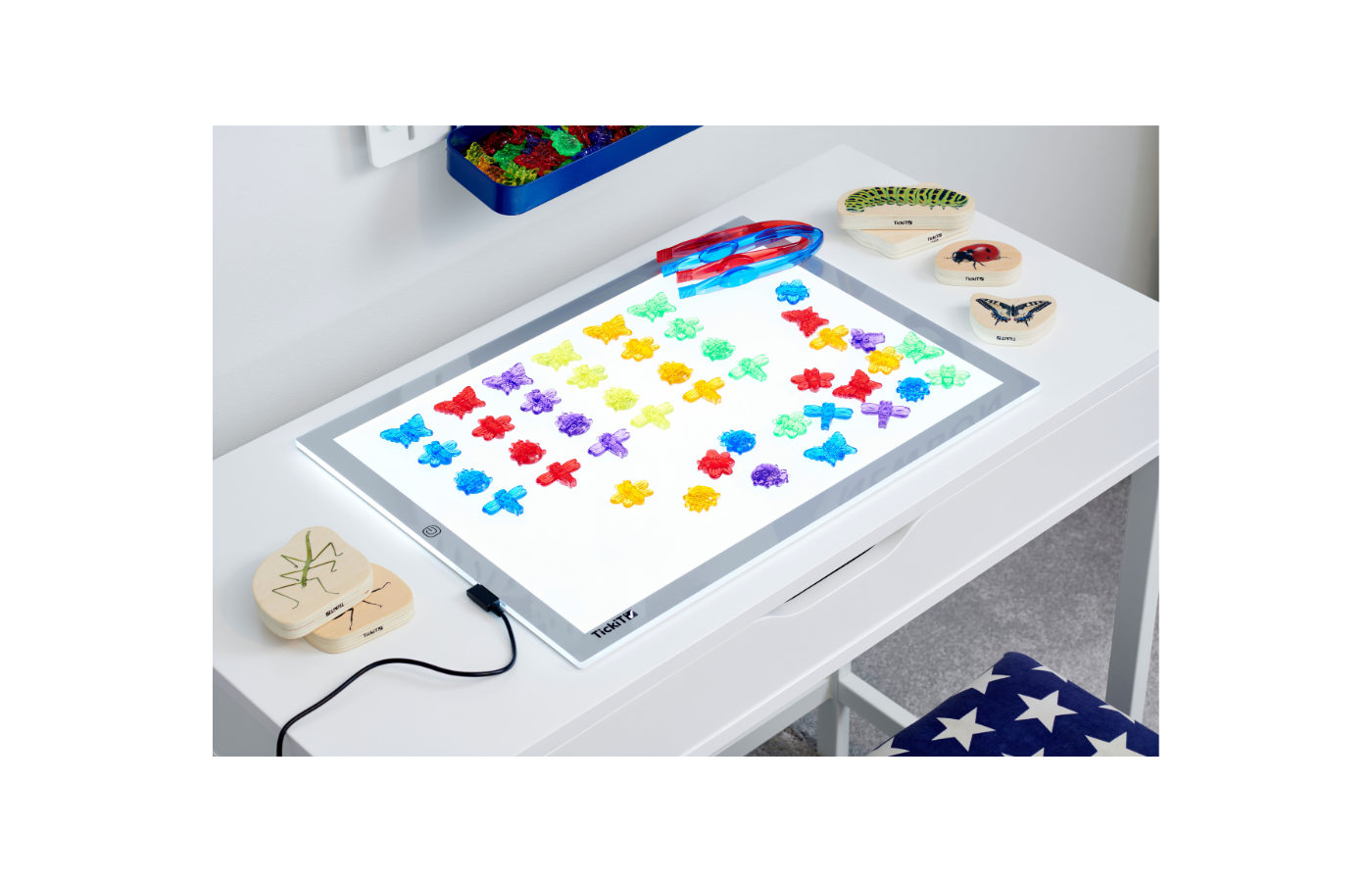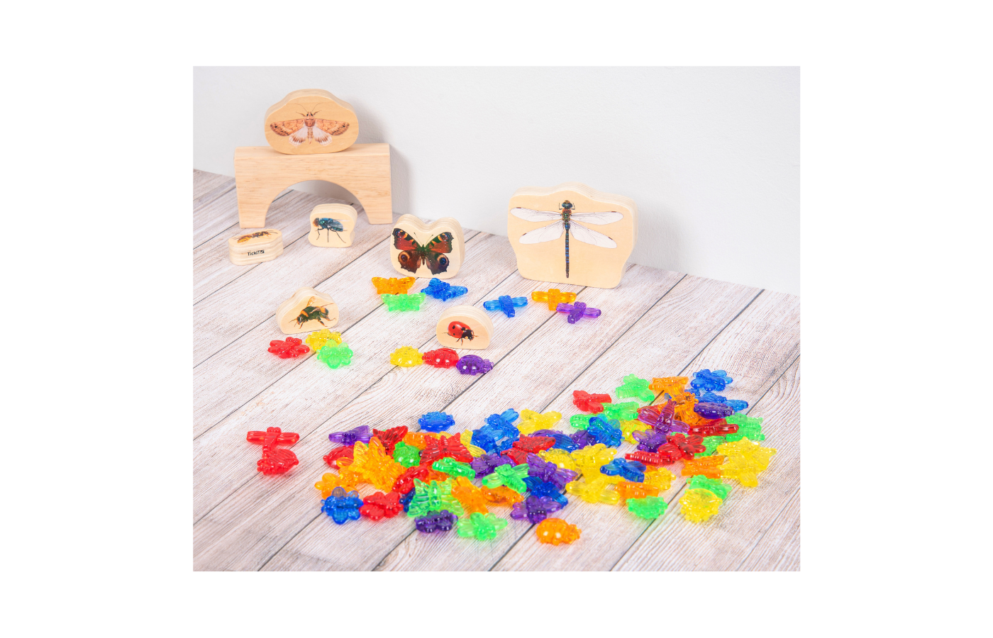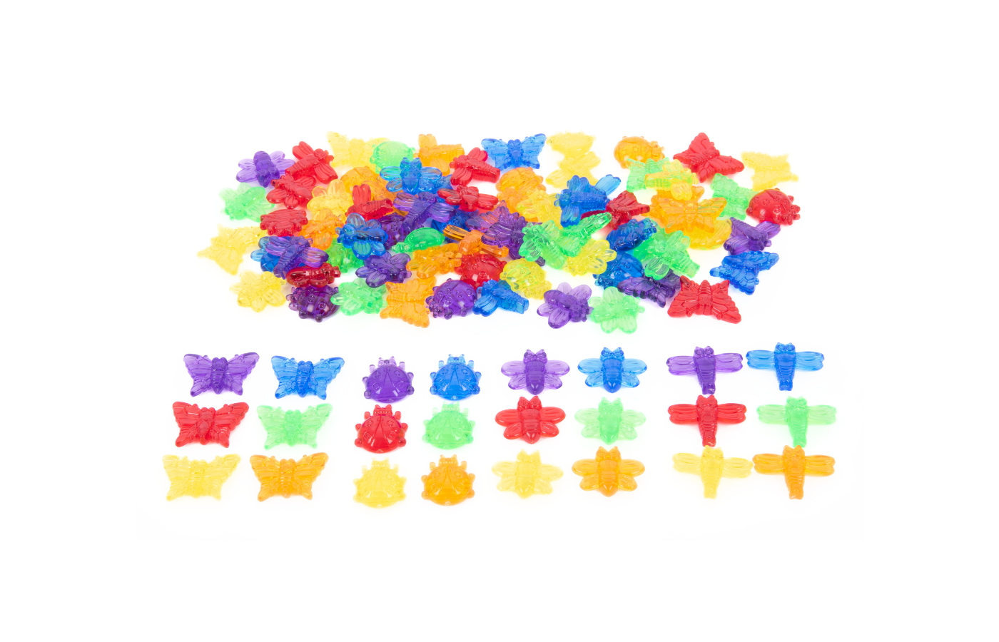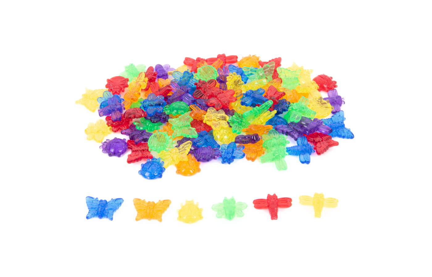 Deze set van 96 insecten in 6 verschillende kleuren en 4 verschillende soorten (vlinder, lieveheersbeestje, libelle en blij) is ontzettend leuk om te gebruiken op de lichttafel of om te leren sorteren. Sorteren kan je doen op kleur, grootte of soort structuur. Op de lichttafel kan je ze over elkaar leggen om de kleuren te mengen.