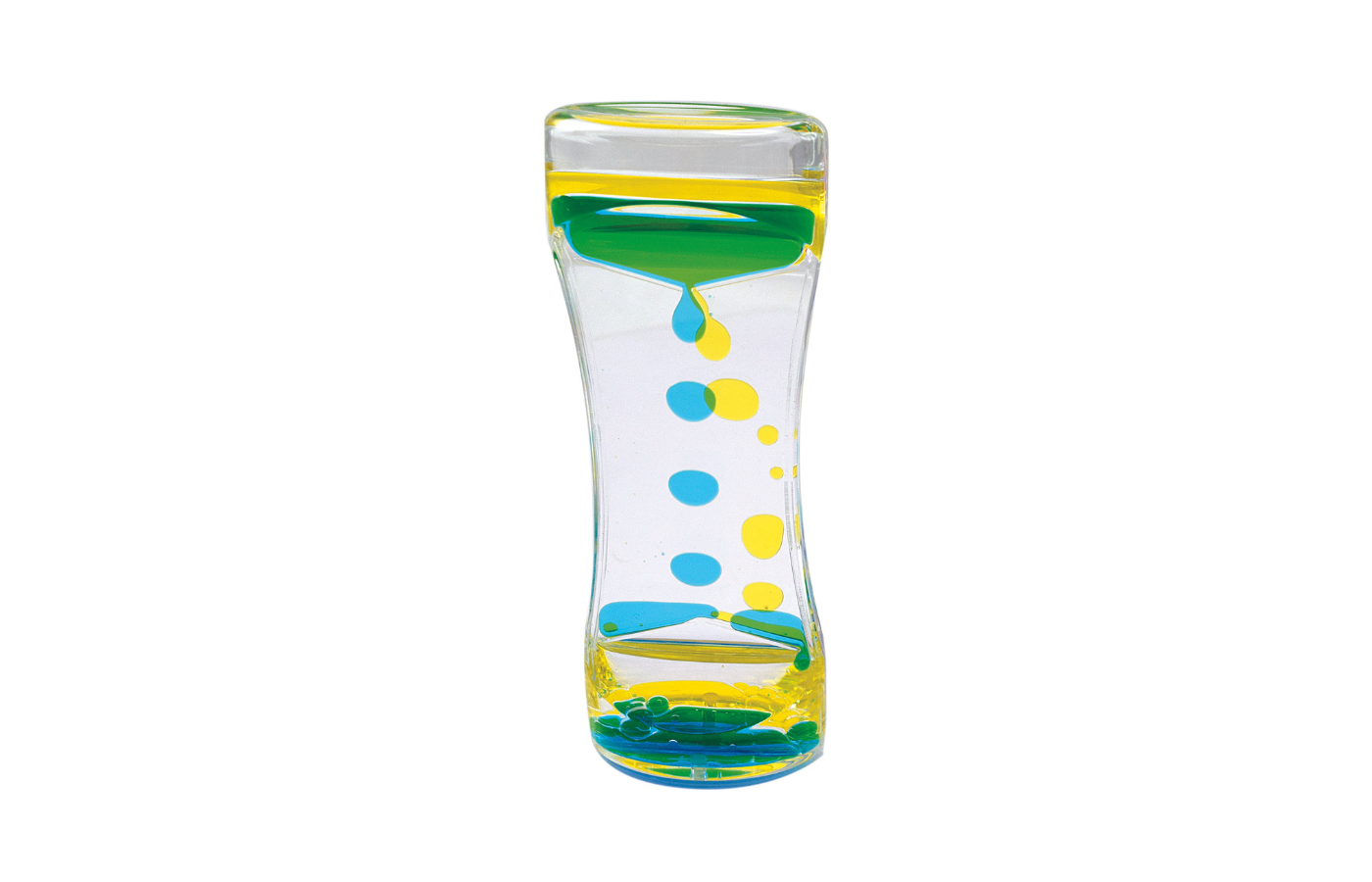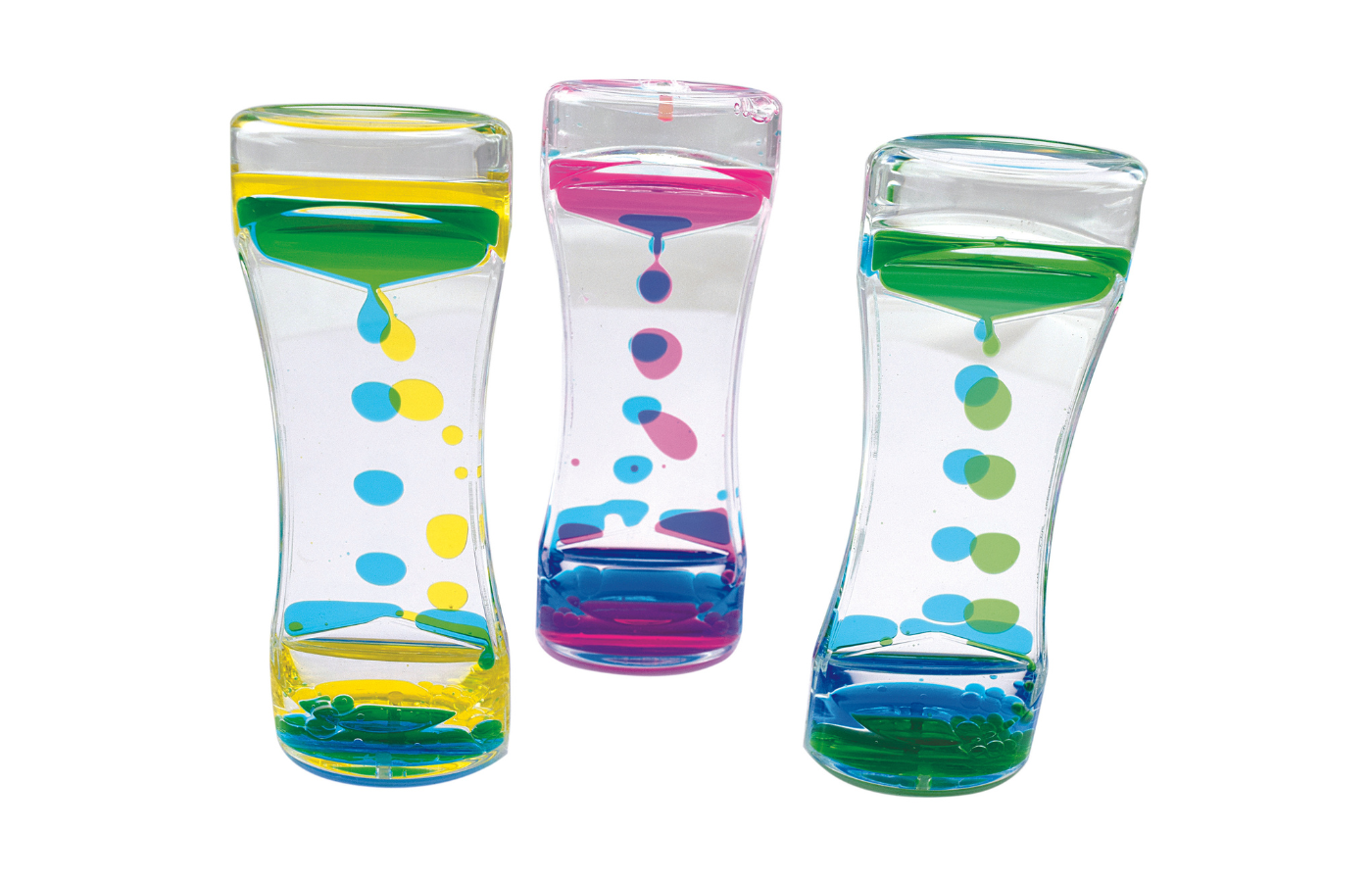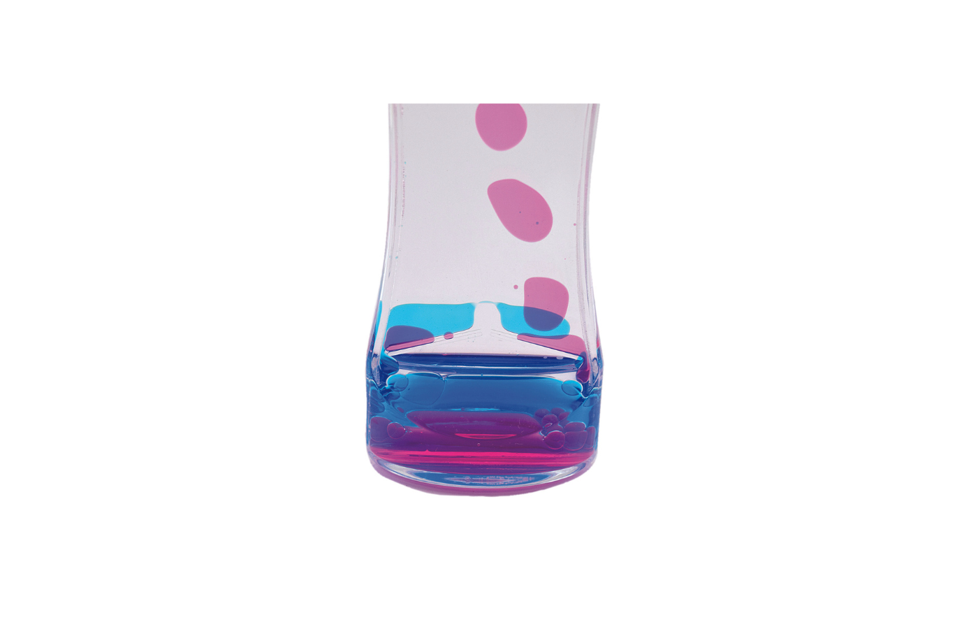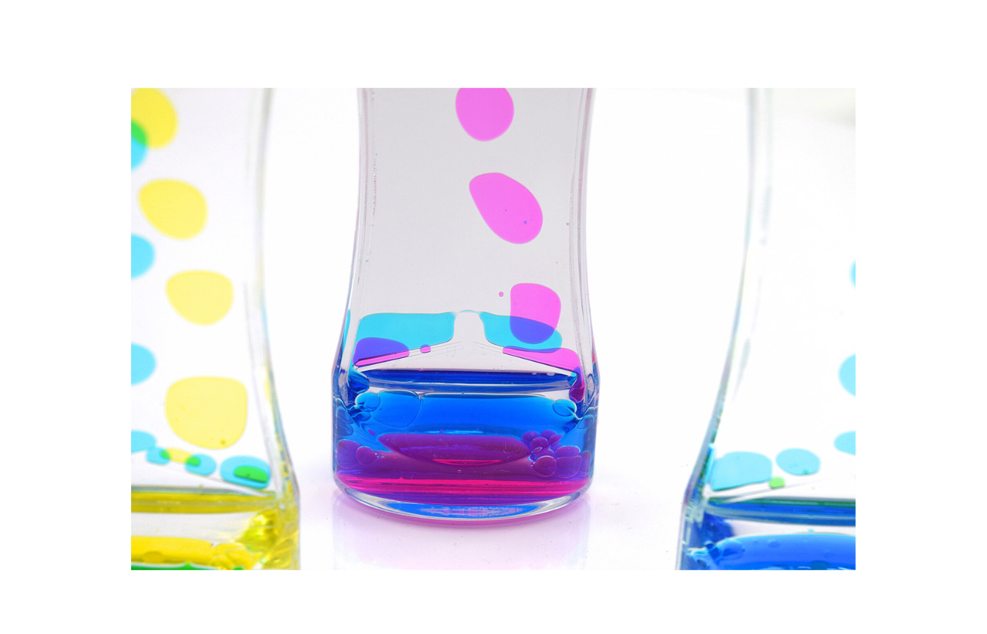 Kristalheldere sensorische vloeistofset met kleurrijke olie en water. Wanneer ze ondersteboven worden gedraaid rolt de gekleurde vloeistof in 2 verschillende kleuren naar beneden. Door de heen en weer beweging in de zandloper worden kinderen rustig en kunnen ze er urenlang naar kijken.