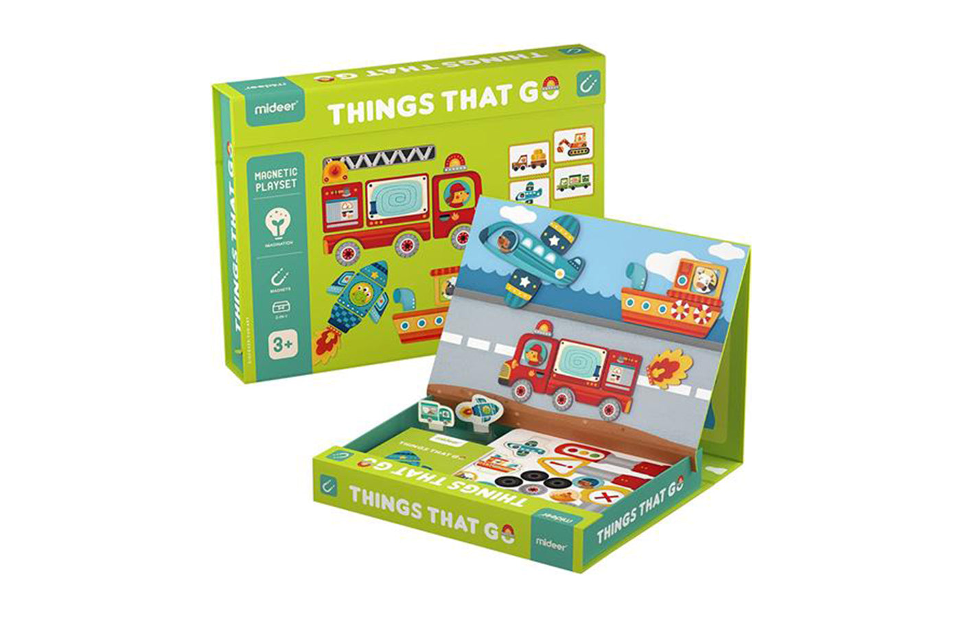 Deze handige doos in de vorm van een boek, met 8 kaarten en 59 magnetische stukjes, is ideaal voor op reis. Maak zelf leuke en gekke transportmiddelen of maak de opdrachtkaart na. Dit spel is 2-in-1 en kan ook als ganzenbord gespeeld worden.