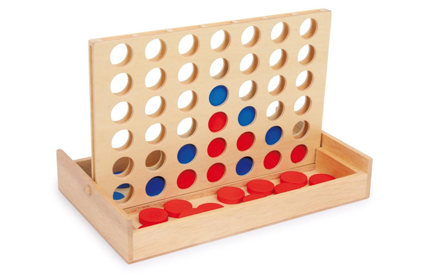 Klassiek 'vier-op-een-rij'-spel. Dit gekende spel in compact formaat zorgt voor veel speelplezier bij zowel kinderen als volwassenen. Door logisch na te denken en concentratie probeer je om 4 schijfjes van de zelfde kleur op een rij te krijgen. Dit kan zowel horizontaal, verticaal als schuin. Het afneembare speelgedeelte kan worden gebruikt om de houten kist veilig af te sluiten. Het spelbord meet 24 x 25 x 16 cm.