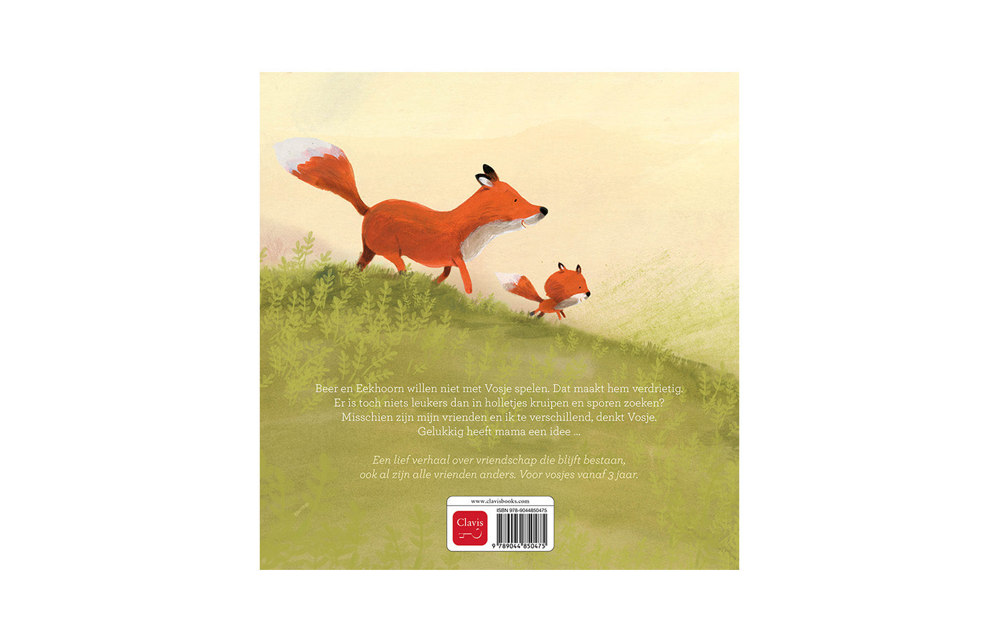 Beer en Eekhoorn willen niet met Vosje spelen. Dat maakt hem verdrietig. Er is toch niets leukers dan in holletjes kruipen en sporen zoeken? Misschien zijn mijn vrienden en ik te verschillend, denkt Vosje. Gelukkig heeft mama een idee… Een lief verhaal over vriendschap die blijft bestaan, ook al zijn alle vrienden anders.