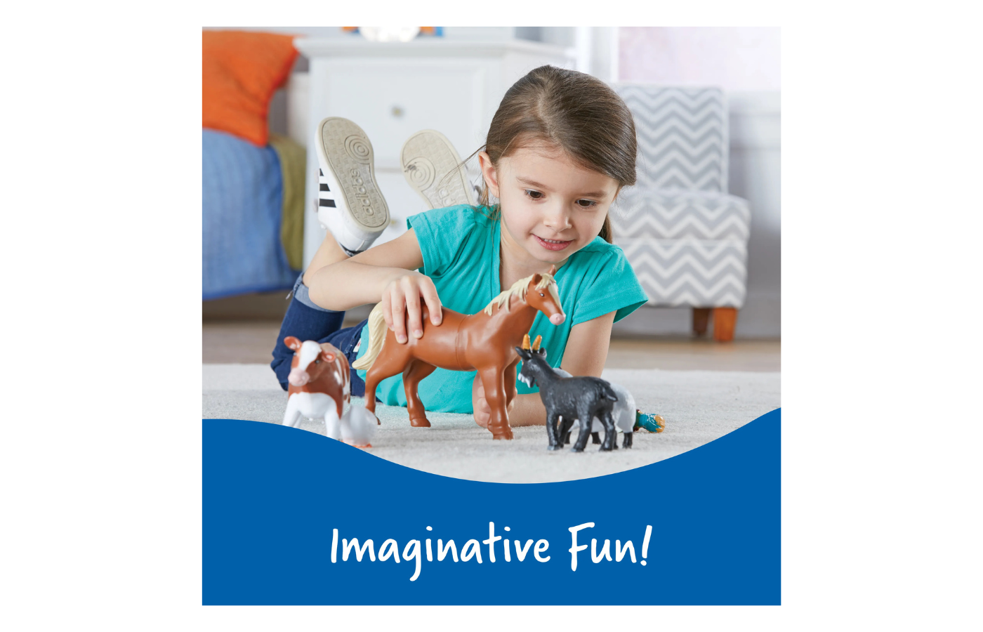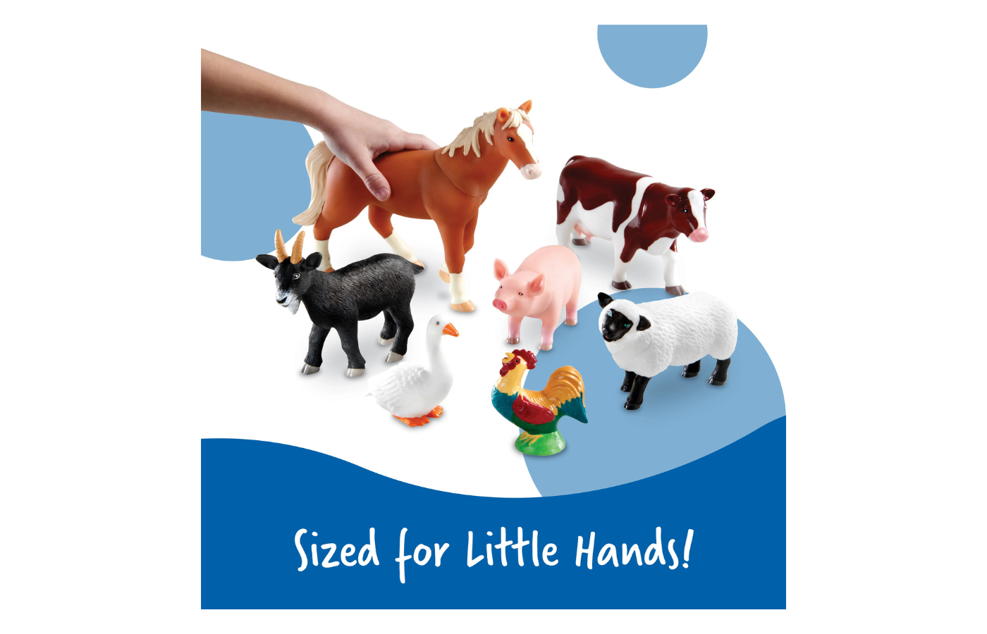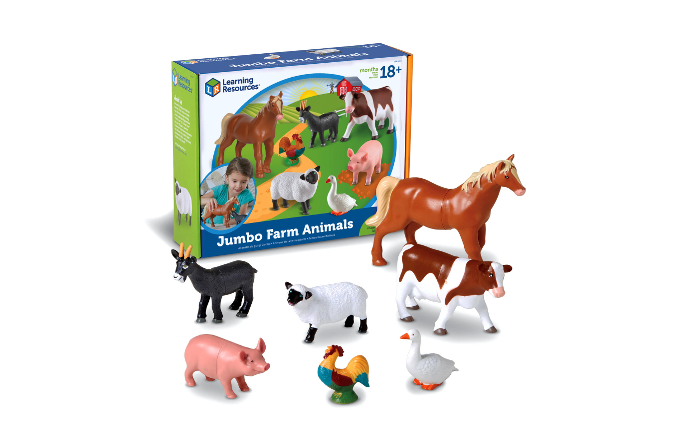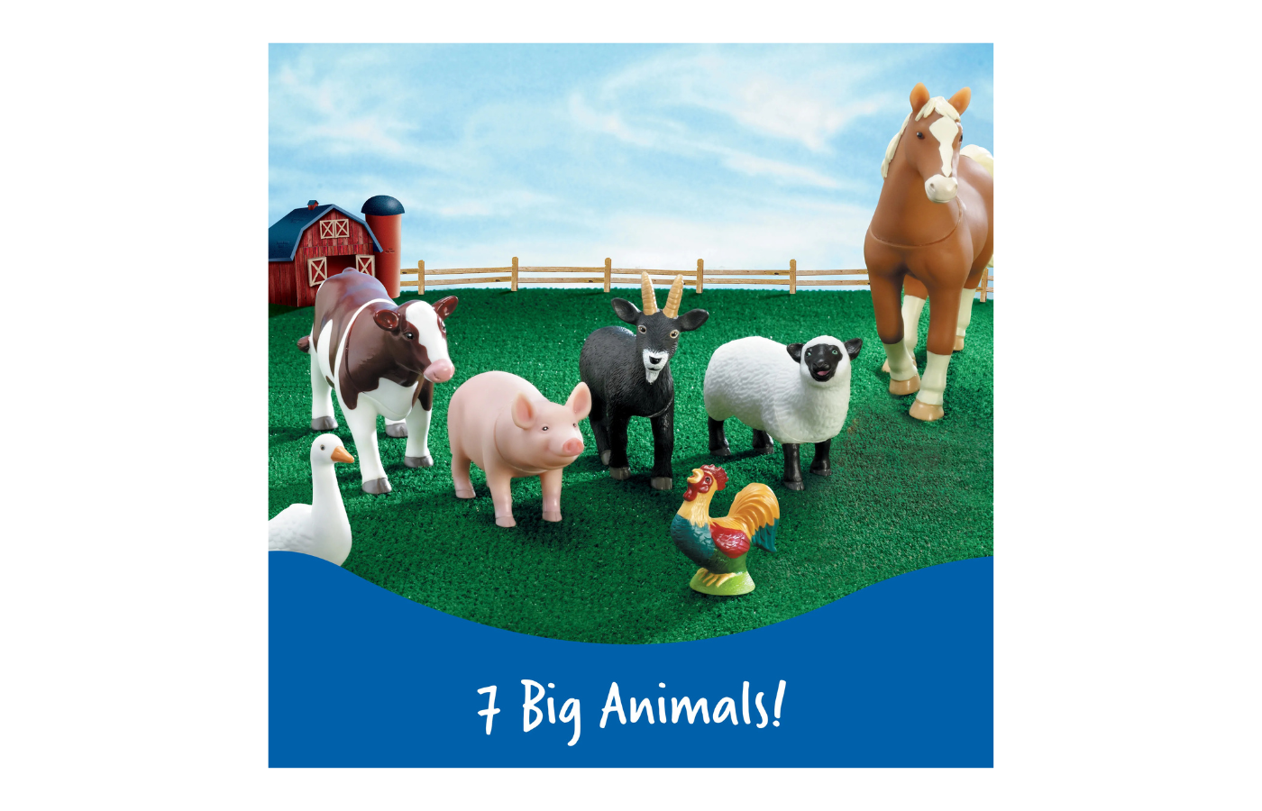 De set bevat een paard, varken, koe, geit, schaap, haan en gans.