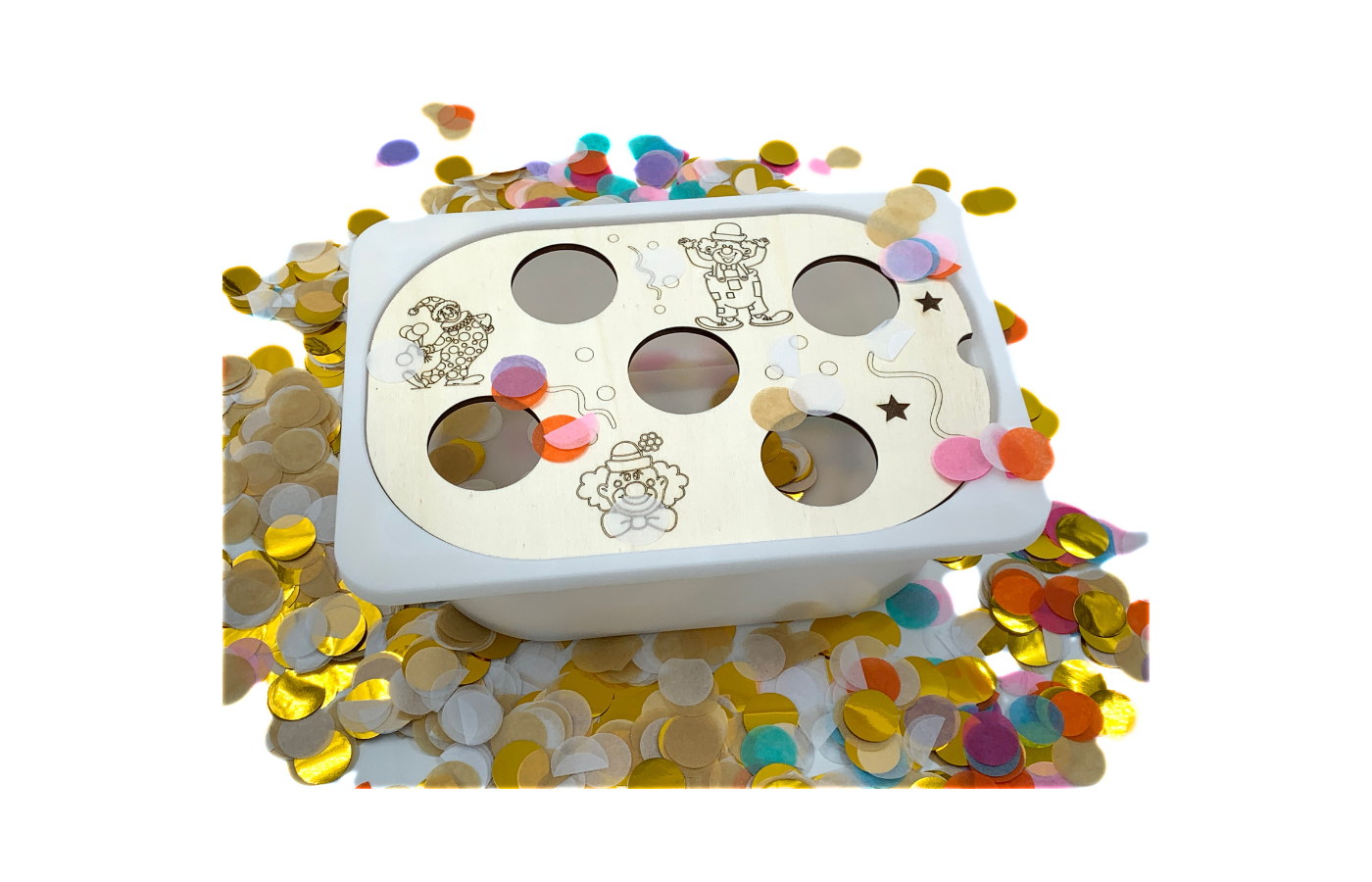 Themadeksel (carnaval - 2-in-1) te gebruiken op de gekende kleine Trofastbakken van Ikea. Te combineren met confetti, serpentines,...