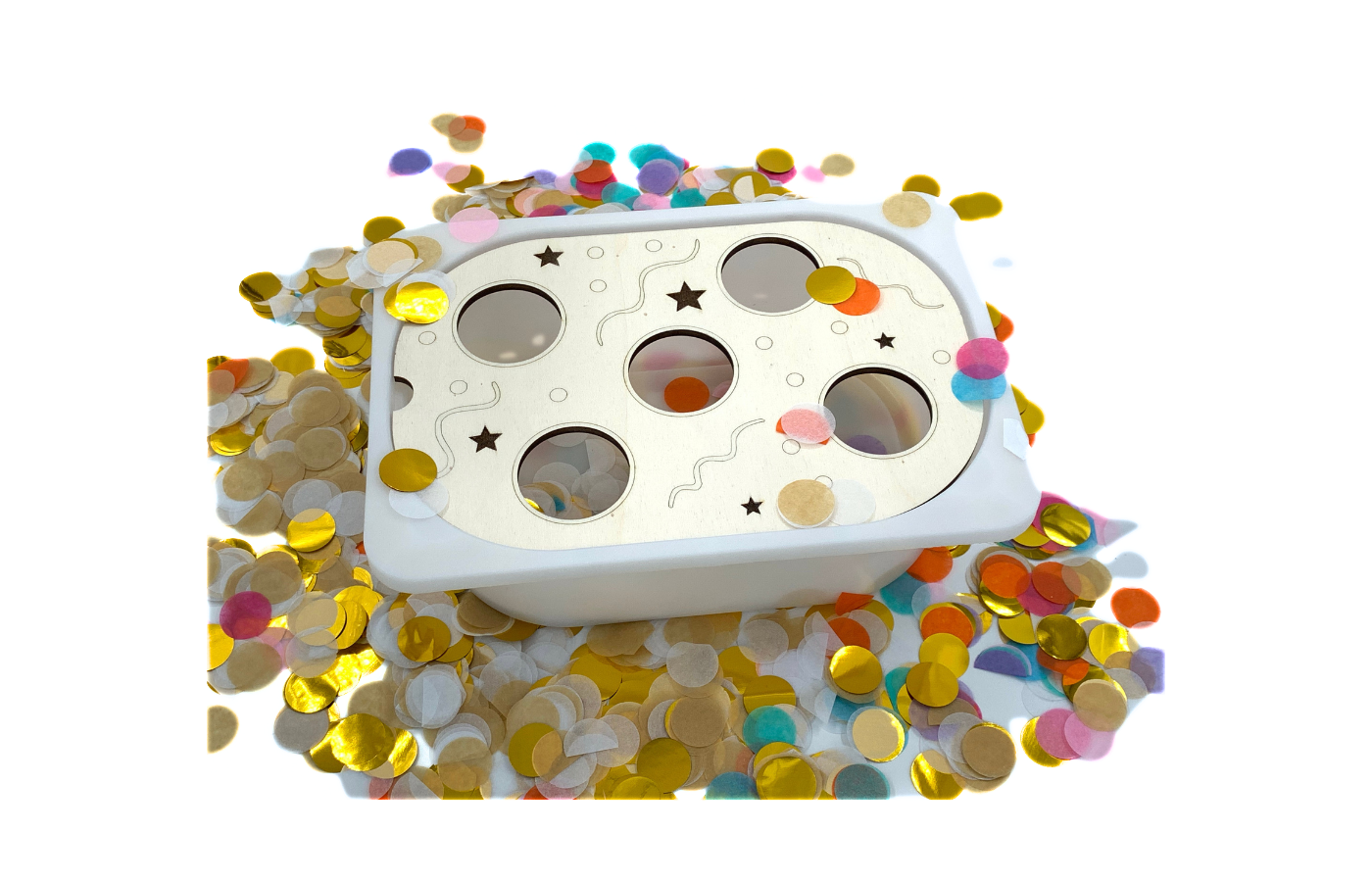 Stimuleren van fijnmotorische vaardigheden door de gaten te vullen met confetti.