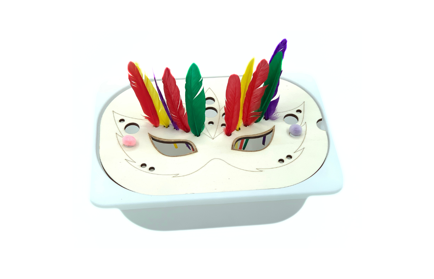 Themadeksel (carnavalmasker) te gebruiken op de gekende kleine Trofastbakken van Ikea. Te combineren met pompons, magnetische bingo fiches, magnetische balletjes en veren. Stimuleren van fijnmotorische vaardigheden door het masker te versieren naar eigen creativiteit.
