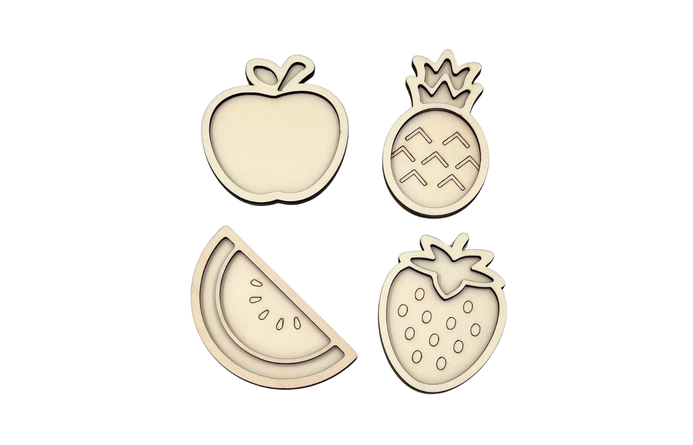Vulvormen of speeltrays in het thema fruit. Vier verschillende fruitsoorten (ananas, aardbei, appel en watermeloen). Perfect te vullen met droge materialen zoals speelrijst, kikkererwten, fijn zand,... In een schattig formaat.