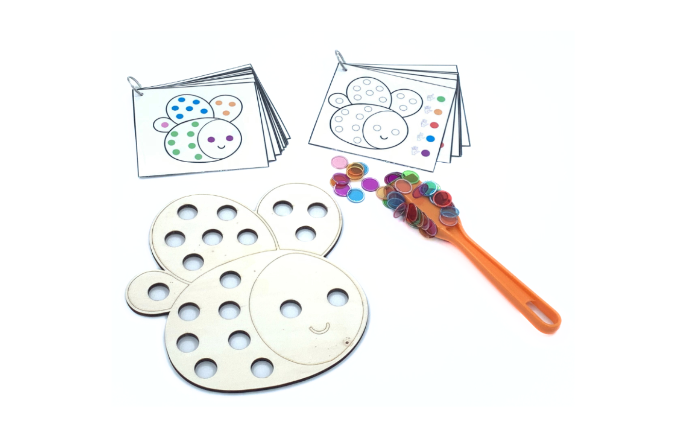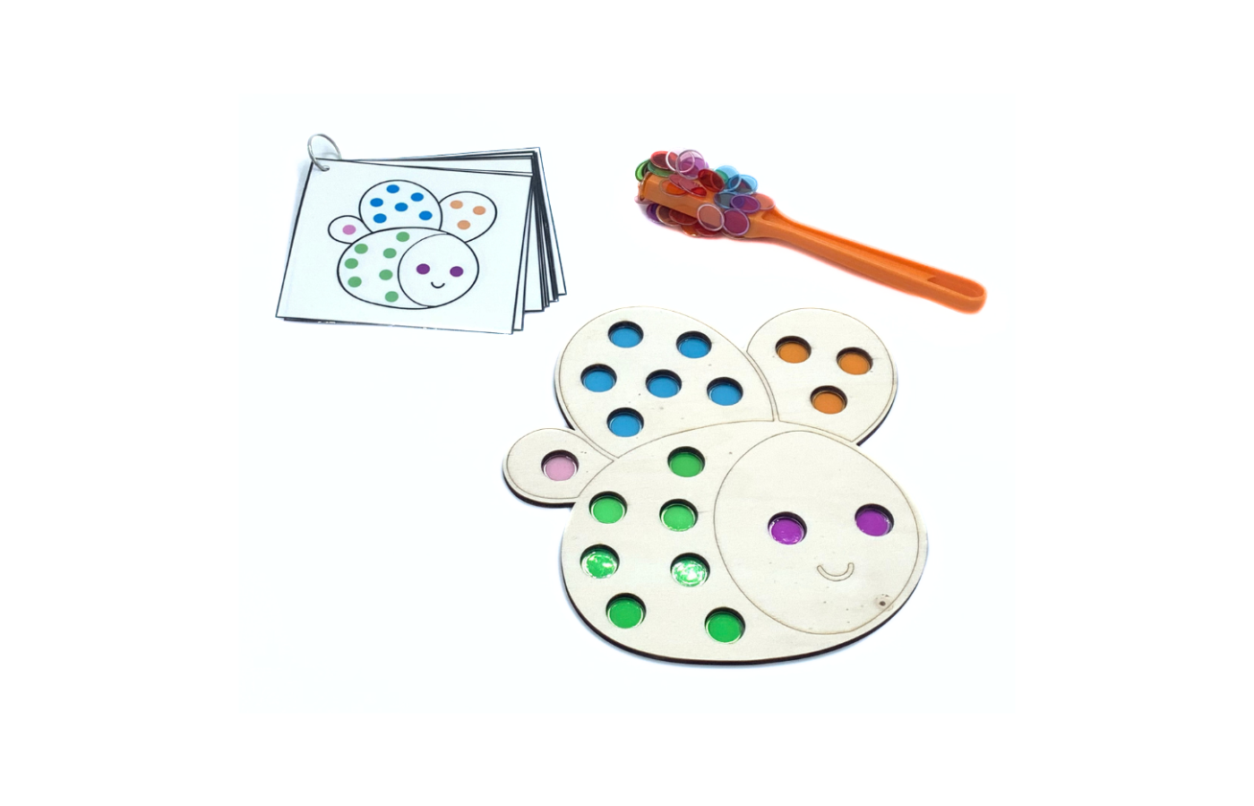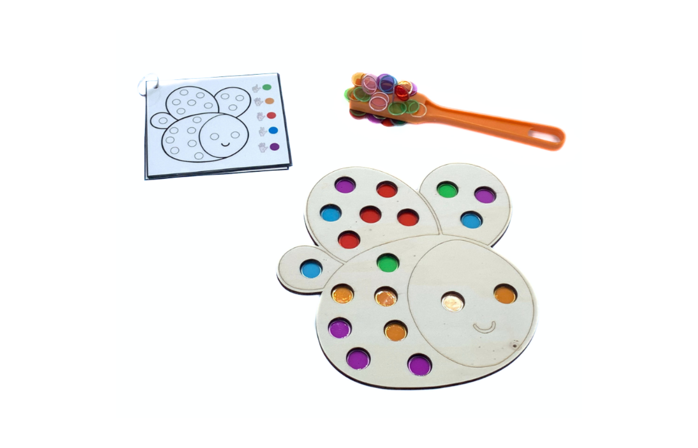 Fijnmotorisch spel met betrekking op ruimtelijke oriëntatie. De kinderen leggen de magneetfiches in de gaatjes van de bij op basis van een opdrachtkaart. Met de magneetstok kunnen de kinderen de fiches op een leuke manier van het spelbord halen.