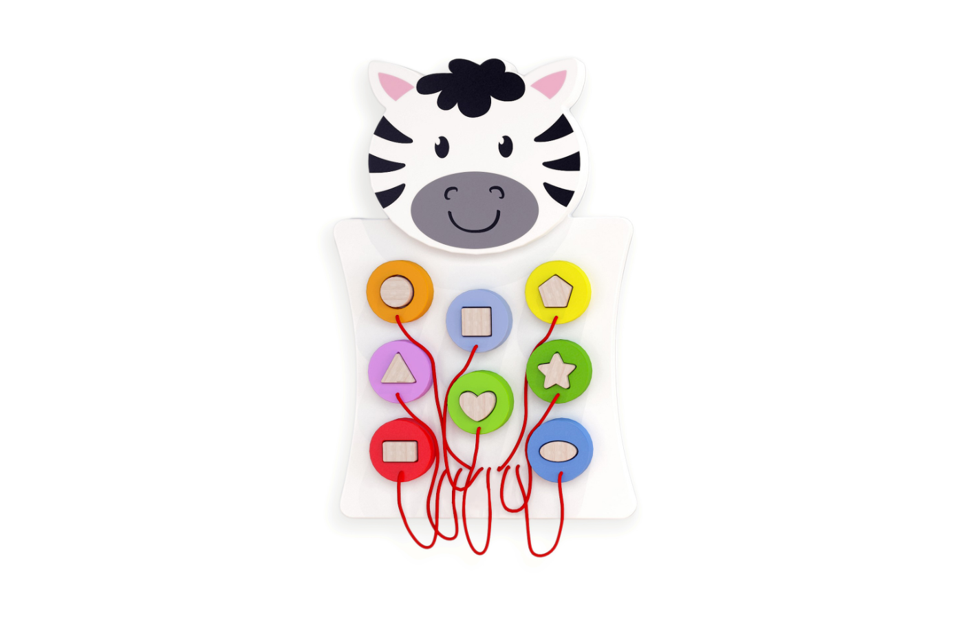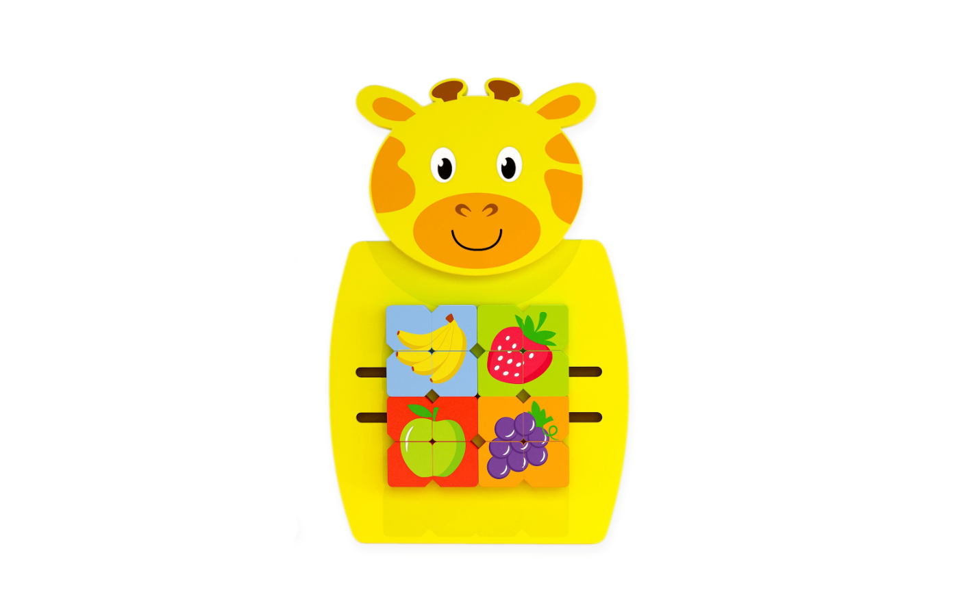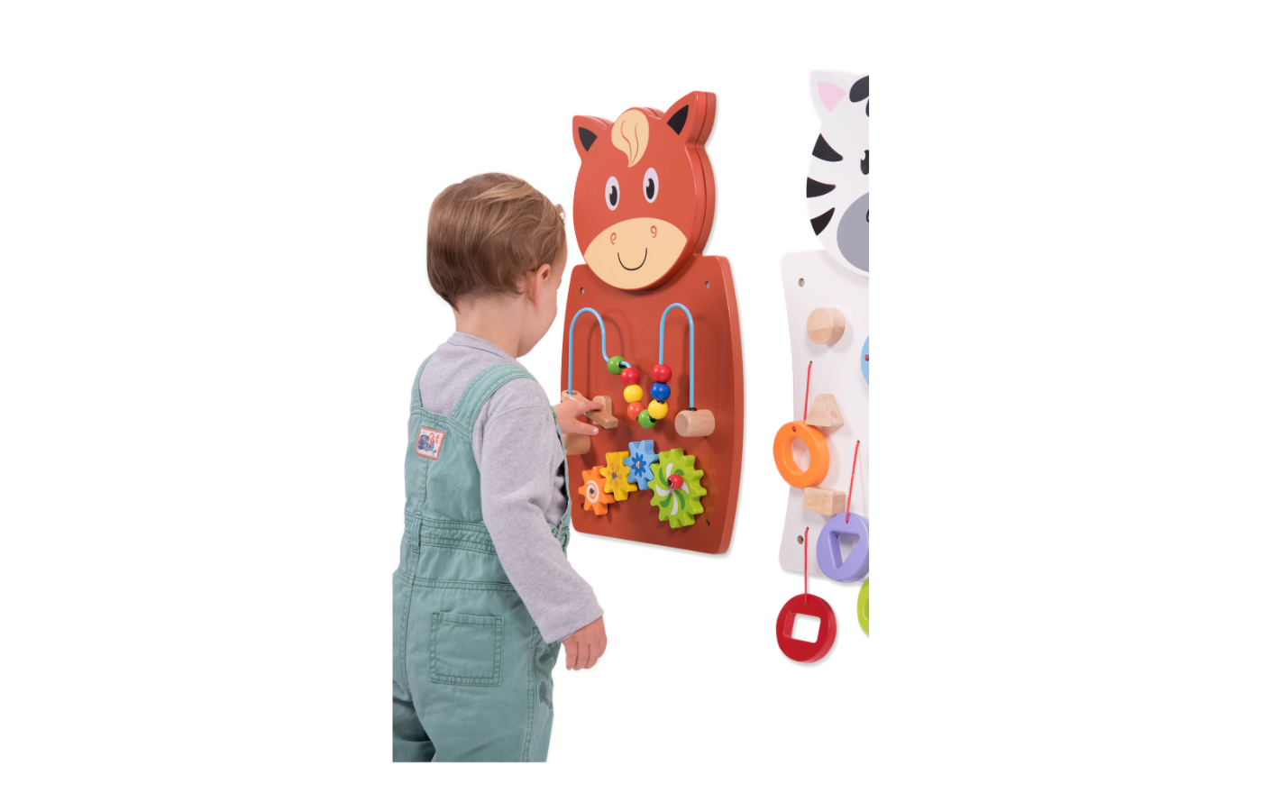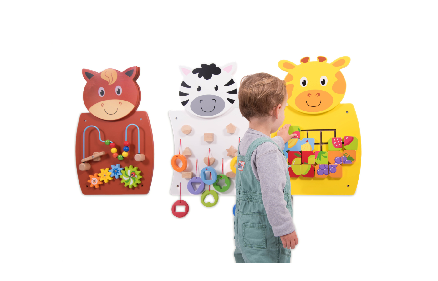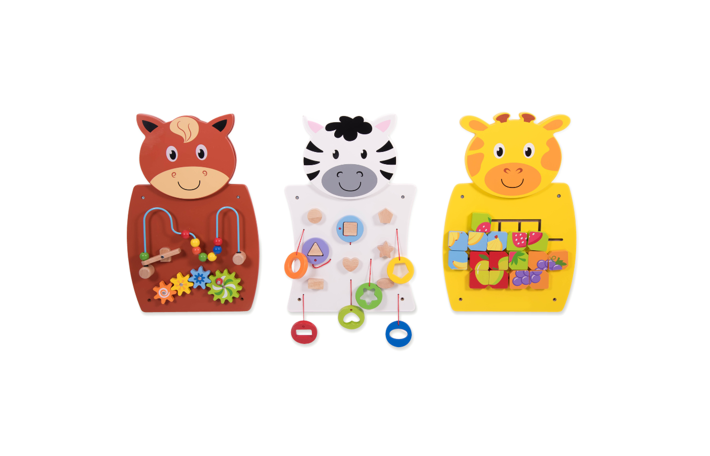 Houten activiteit wandpaneel in de vorm van een paard, giraf of zebra. Het wandpaneel heeft verschillende manipulatieve activiteiten om de hand-oogcoördinatie en fijne motoriek te stimuleren. Het paneel in de vorm van een paard met kralen en tandwielen, een gele giraf met fruitpuzzelblokken en een zwart-witte zebra met kleurrijke vormen.