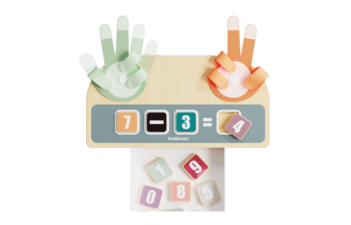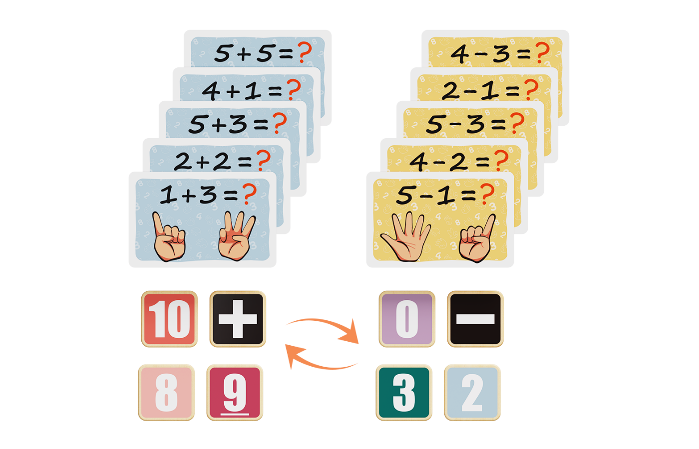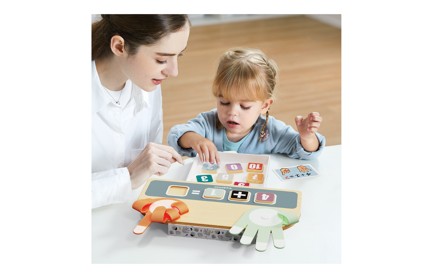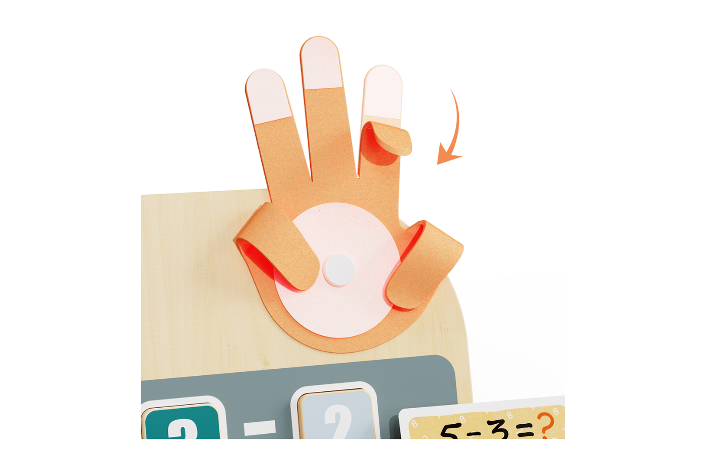 Twee zachte vilten handen met klittenbandsluitingen maken het mogelijk om vingers los te bevestigen en tellen visueel te maken. In combinatie met de houten cijferblokjes en dubbelzijdige opgavekaartjes leren kinderen optellen en aftrekken op een concrete en begrijpelijke manier.