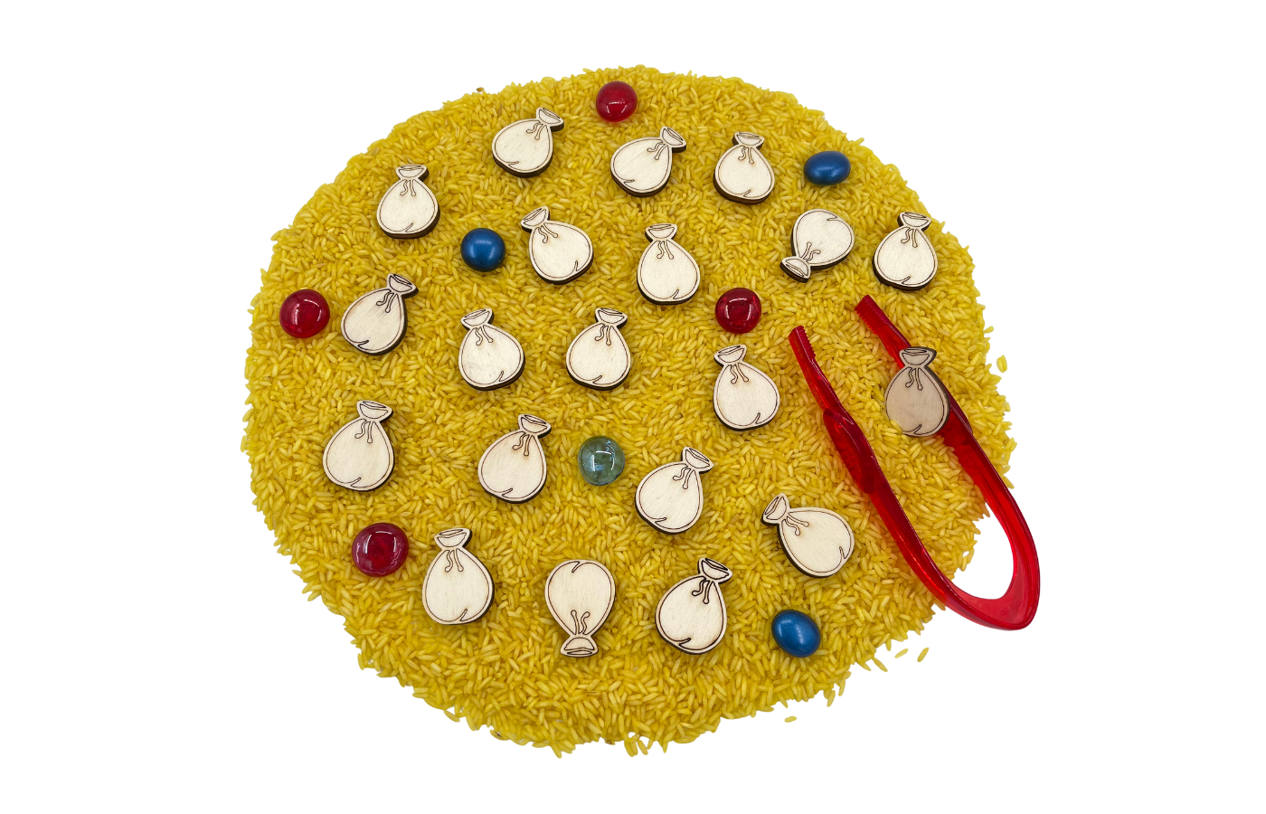 Een zakje met 20 houten strooihoutjes in het thema Sint. Te gebruiken om te tellen, knutselen of als aanvullend materiaal tijdens sensorisch spel.