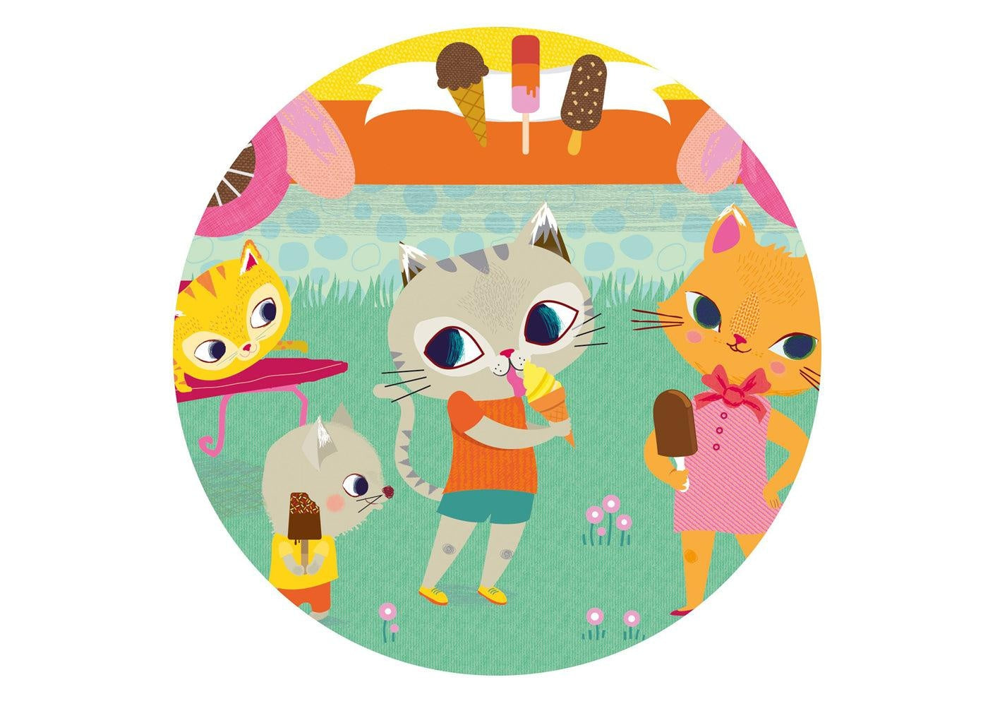 Puzzle of 16 pieces in the theme 'ice cream truck'. The ice cream truck is here, the cats are getting a treat! This beautiful puzzle comes in a nice box in the shape of an ice cream truck. A spinning ice cream cone brings the van to life. This puzzle awakens the imagination for storytelling and storytelling.