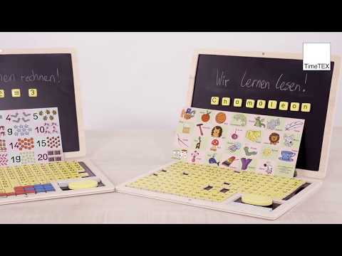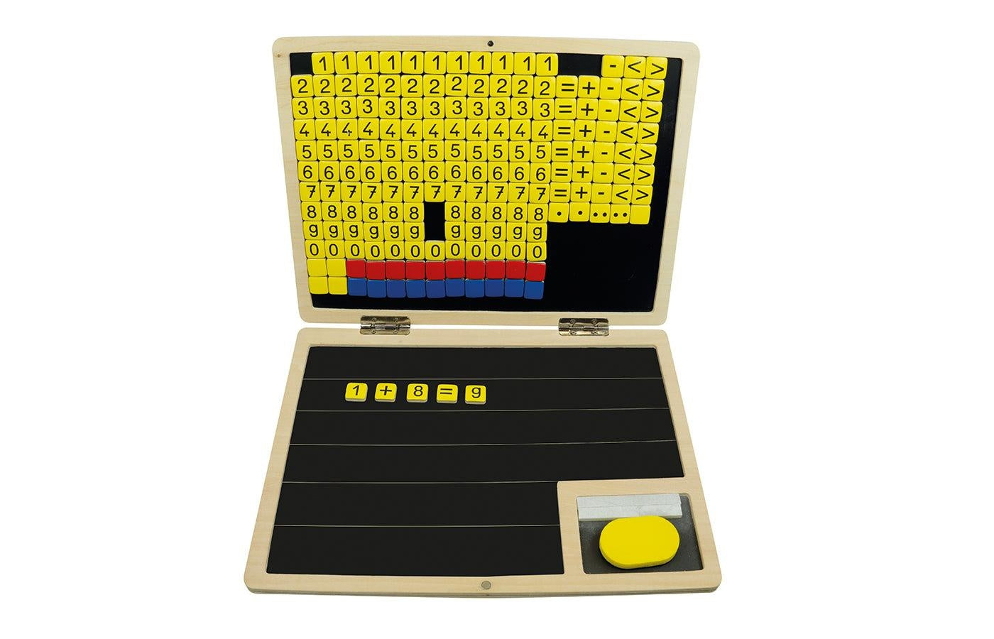 With this wooden math laptop, children can learn the numbers and perform the first math assignments, compare number values and experiment themselves. The screen is a magnetic board surface that can be written on with chalk or provided with magnets. The ground plane is also magnetic and equipped with 5 lines for better orientation. The magnetic wooden tiles can be used both on the board and on the ground surface.