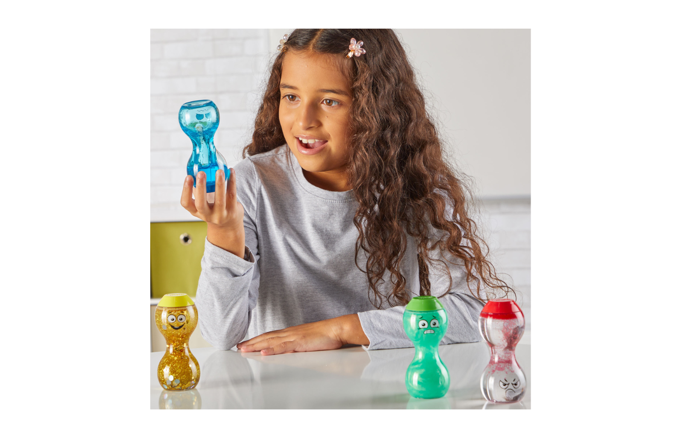 Happy contains gold glitter, sad has a slow-motion lava lamp-like effect, angry is red and scared is green. Move the bottles around and watch the mesmerizing movement of the liquid and the color inside.