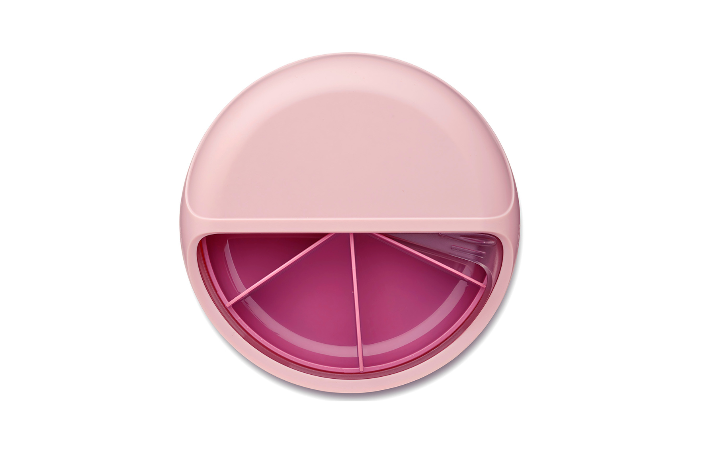 The snack disc makes snacking fun and convenient! With five rotating compartments, you can easily carry different snacks without them getting crushed.