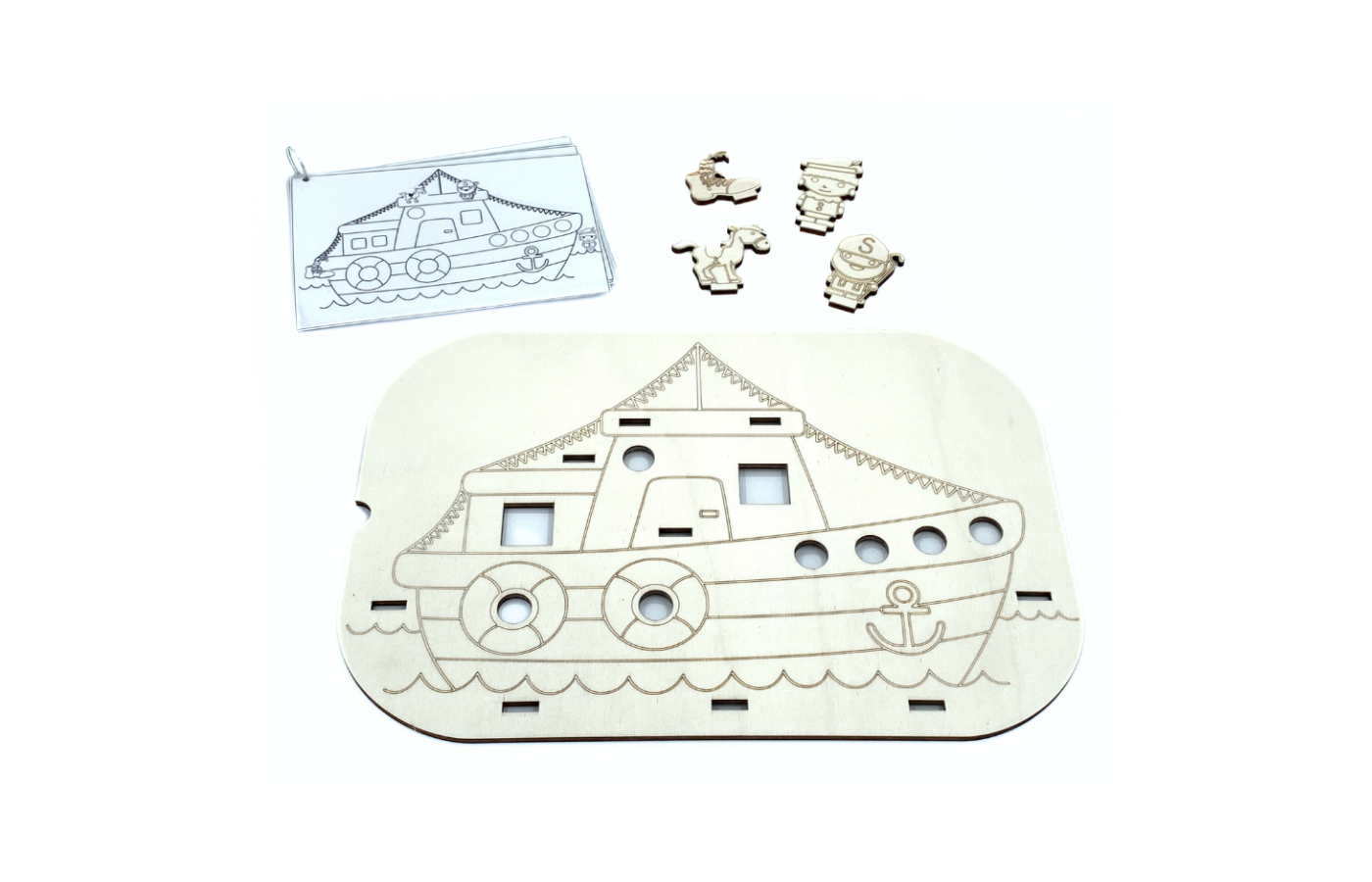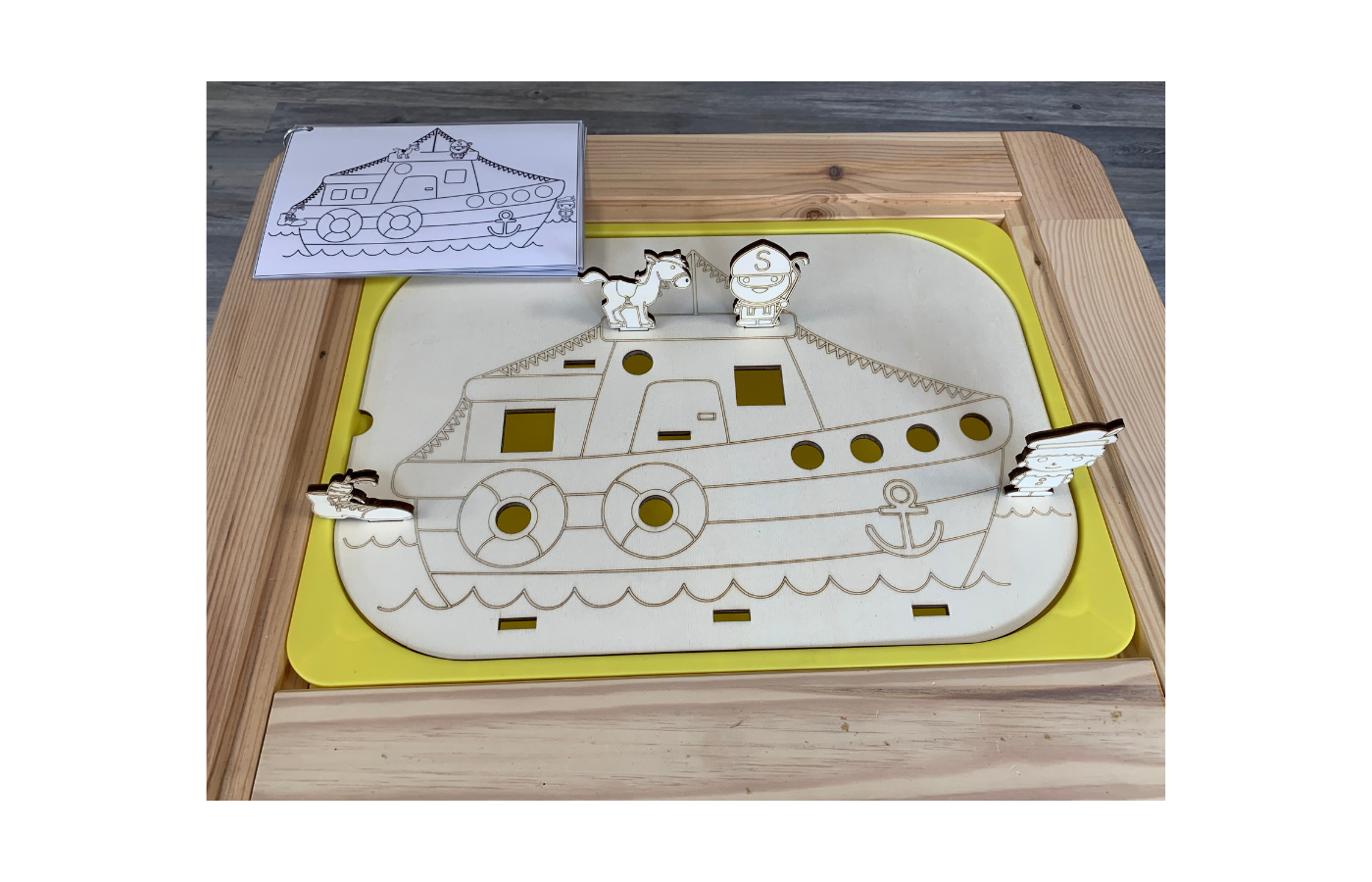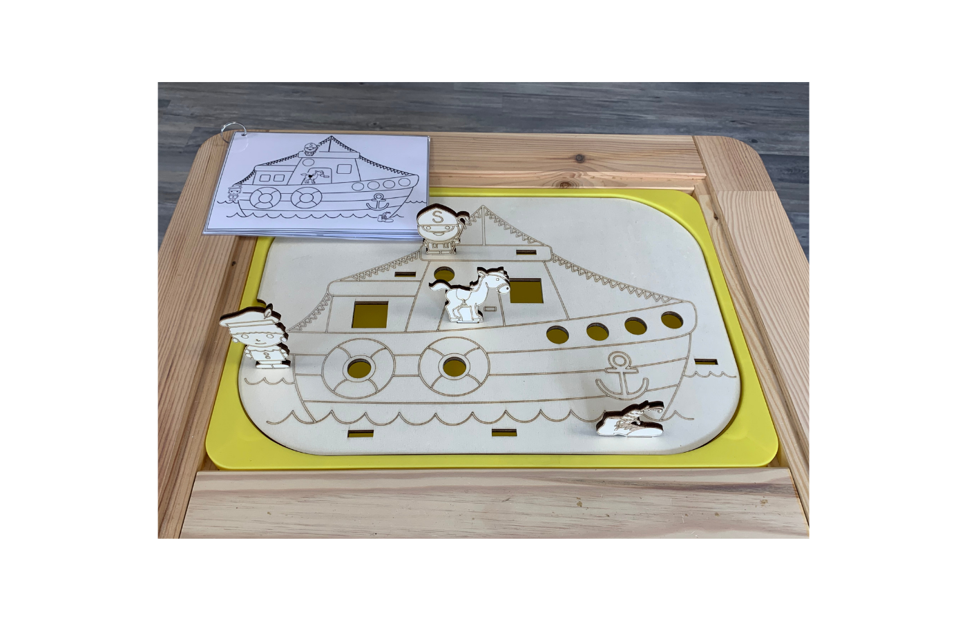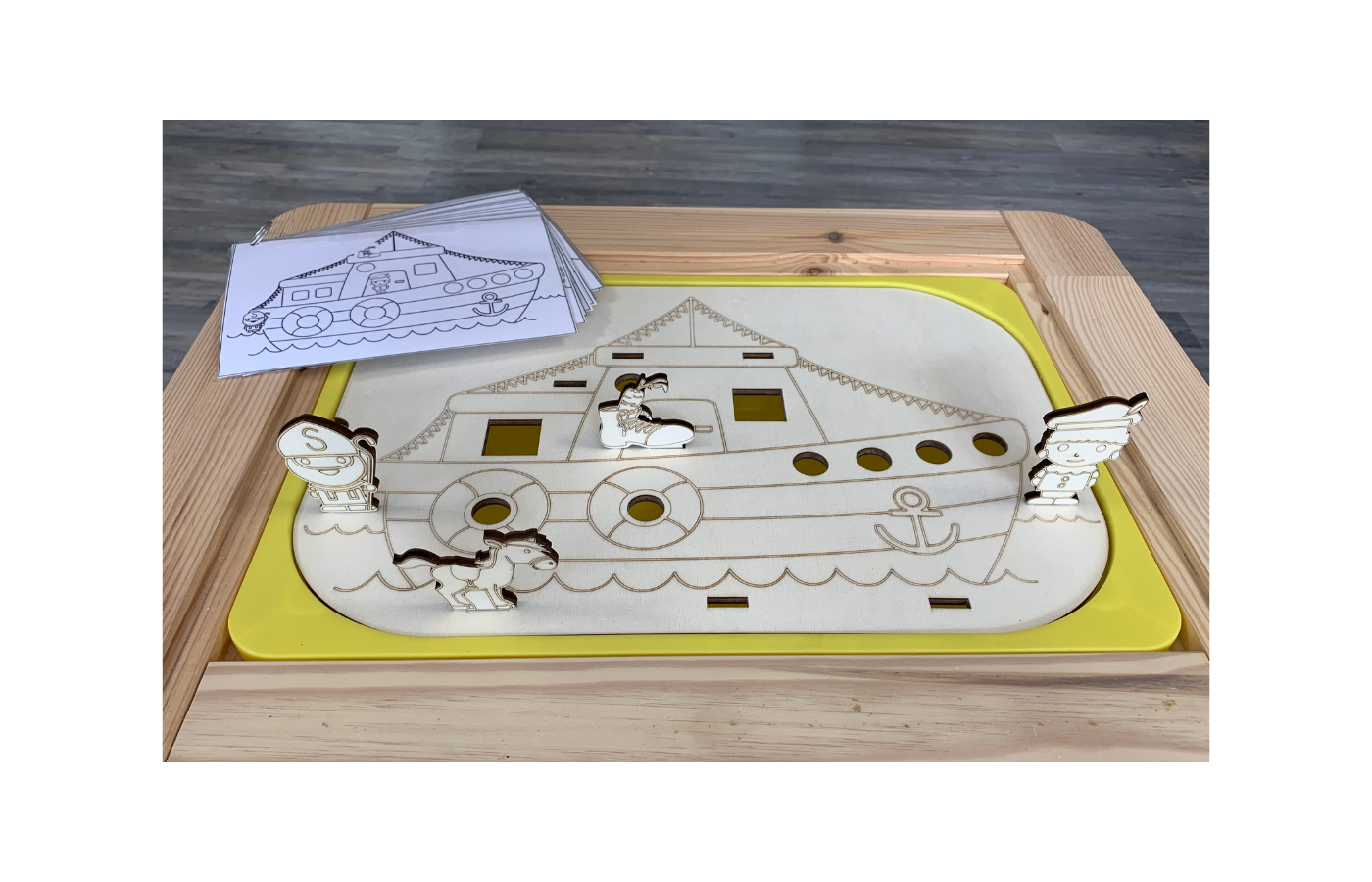 Theme lid (steamer) to be used on the well-known Trofast containers from Ikea. Place the wooden game figures in the correct place in the steamboat and practice the spatial concepts of front, back, under, above, etc. Can be combined with colored cubes in pompoms. Stimulate fine motor skills by putting the blocks (presents) and pompoms in the steamer.