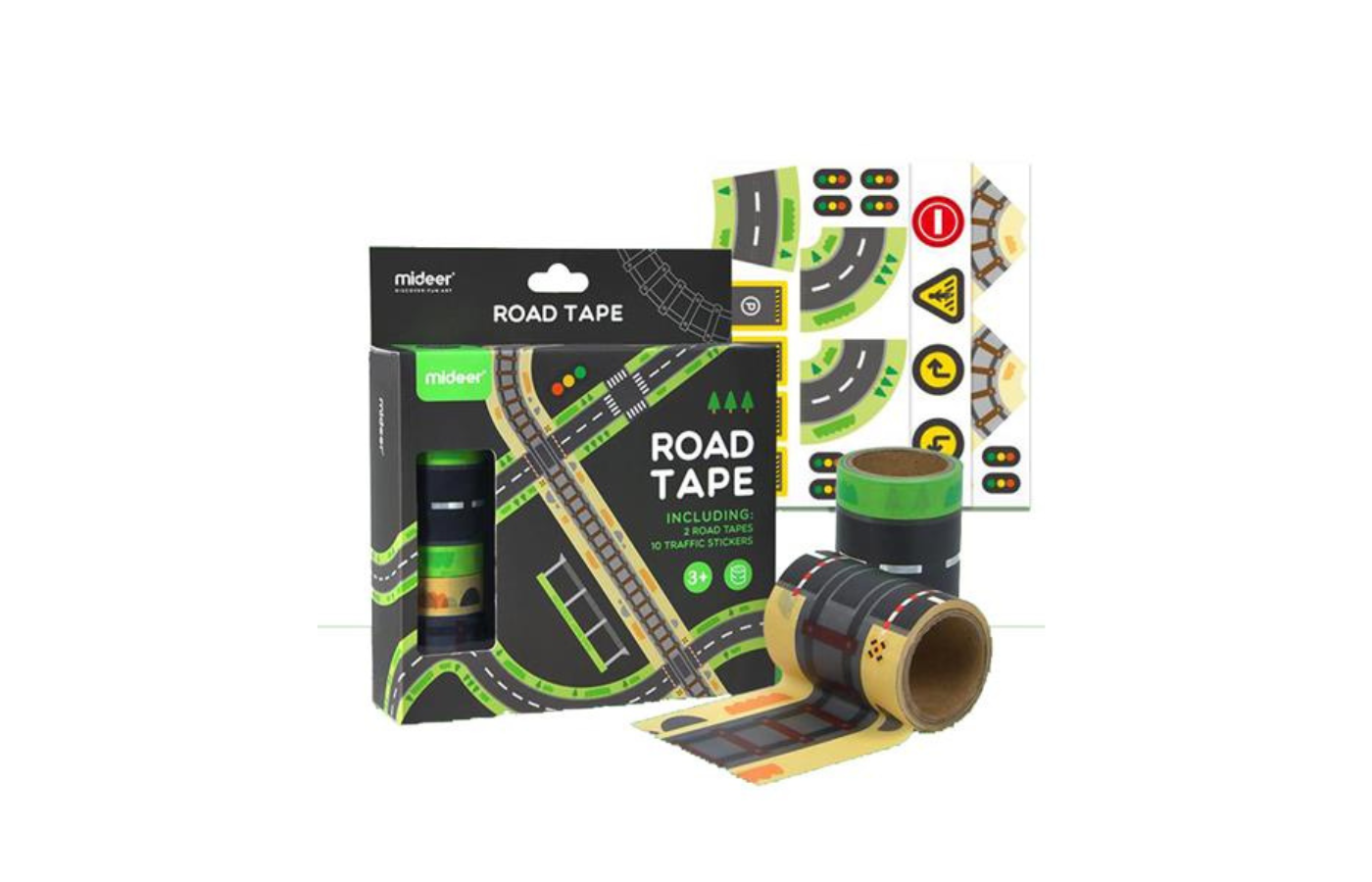 Handy tape for creating your own traffic map. This set contains two 5-meter rolls and 10 sheets of traffic stickers, giving you countless possibilities for creating your own map.