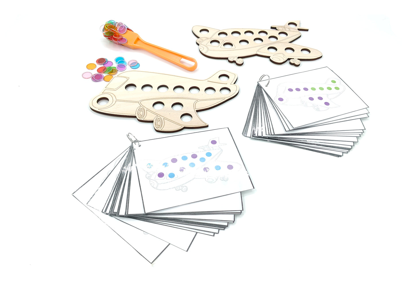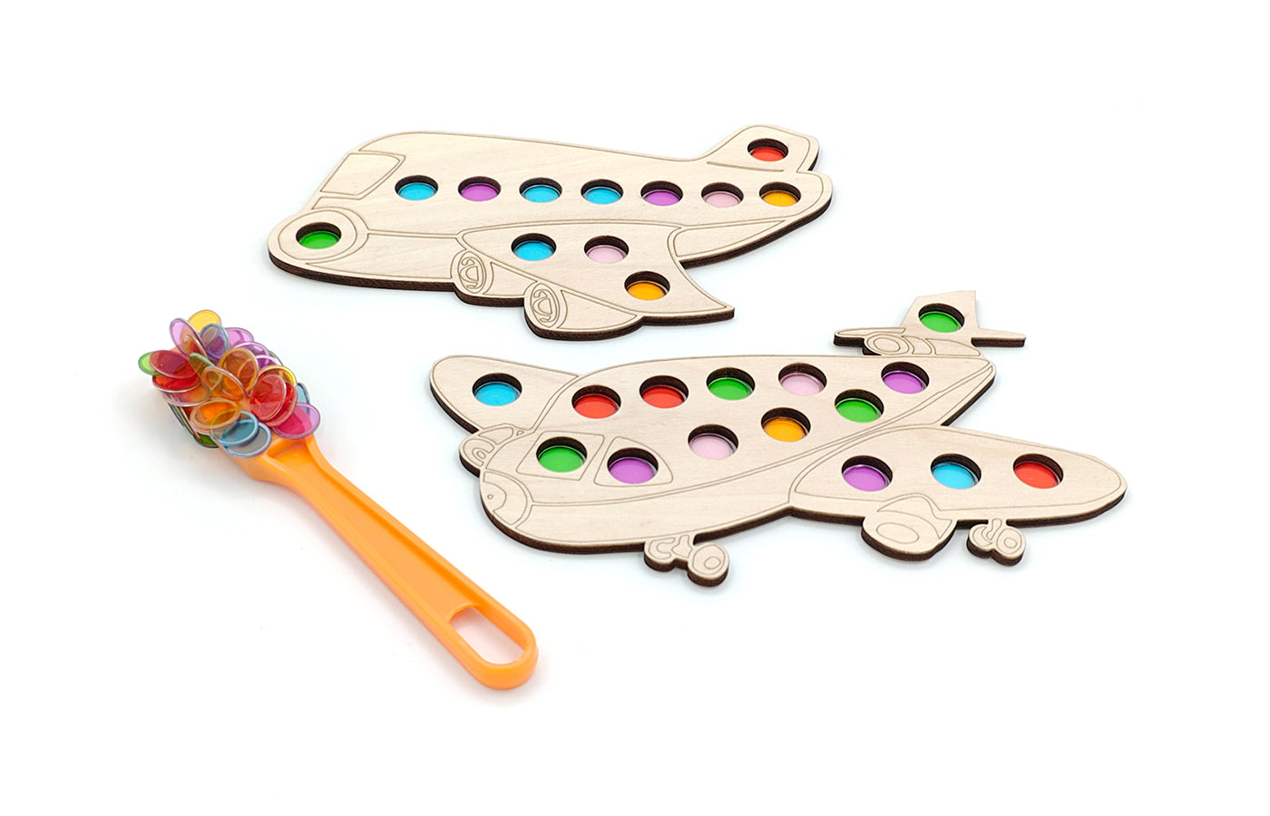 Fine motor play related to spatial orientation. The children place the magnetic tokens in the holes of the planes based on an assignment card. With the magnetic stick, the children can remove the chips from the game board in a fun way.