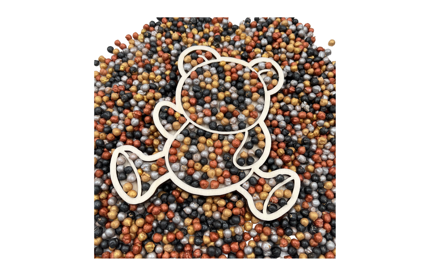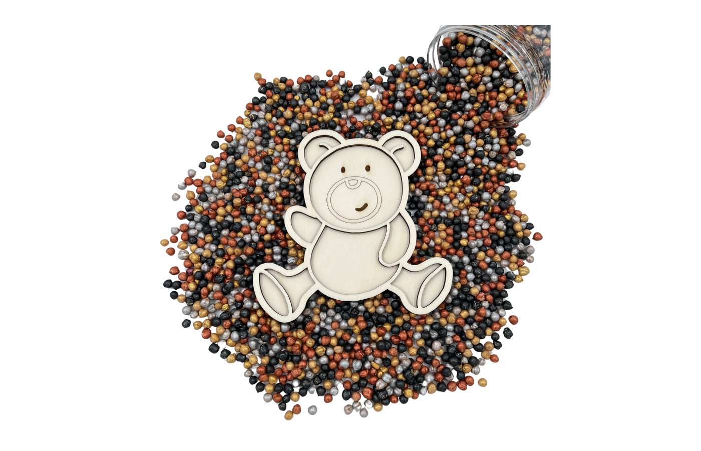 Filling mold or play tray in the shape of a bear. Perfect to fill with dry materials such as play rice, chickpeas, fine sand, ... Matching the picture book 'The big bear picnic'.