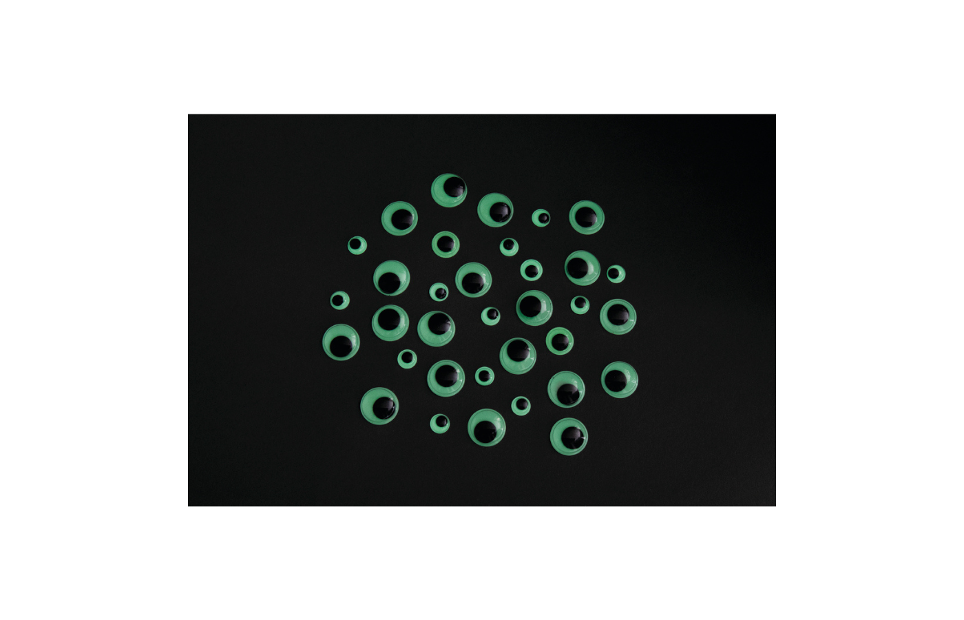 Pack of 110 self-adhesive googly eyes in 11 different sizes.