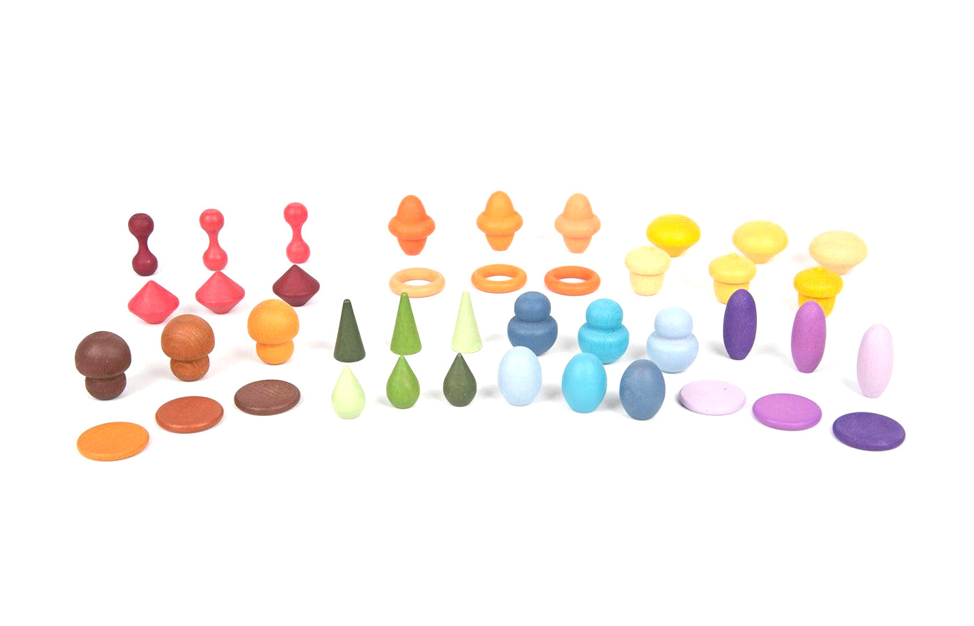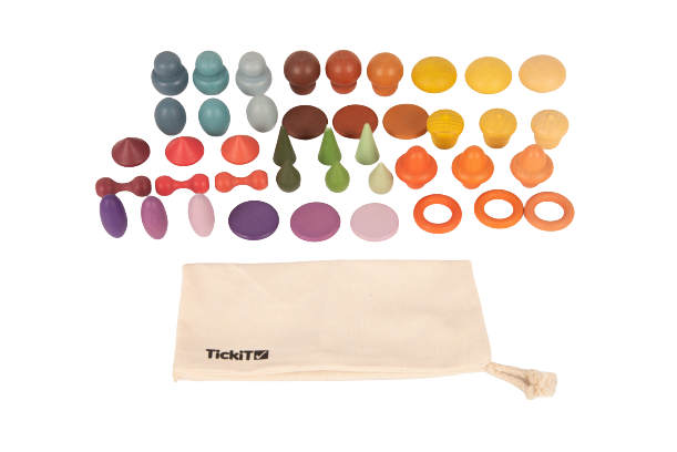 A beautiful set of 42 smooth wooden loose parts inspired by nature and discovery. Each shape is available in 3 shades of one color. The loose parts will stimulate the imagination, develop coordination and improve fine motor skills. These can be used to make figures, practice counting and sorting, design patterns and sequences.