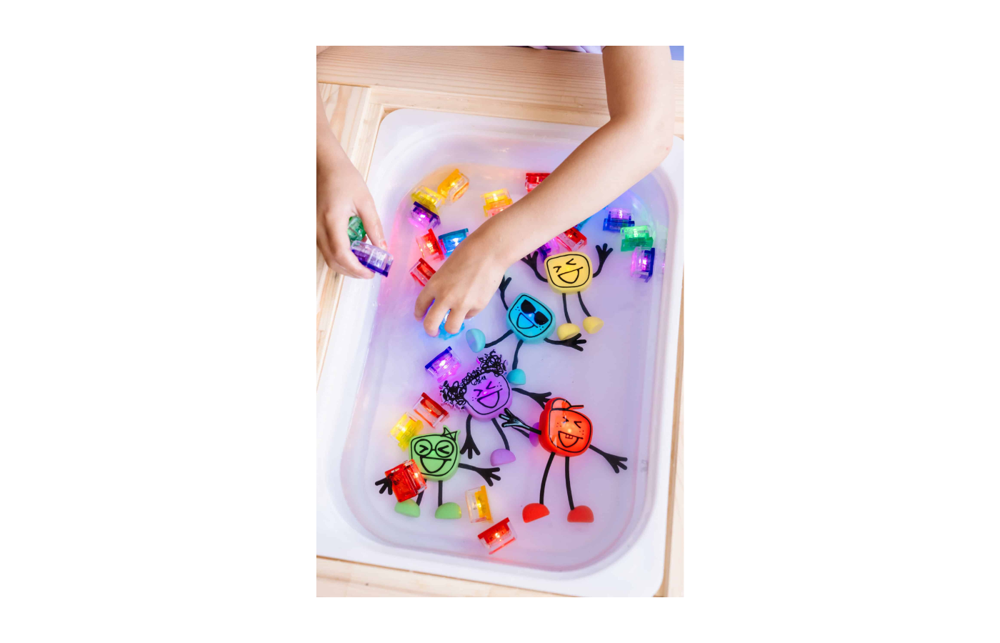 It becomes even more fun if you throw different cubes and figures into the water, making the water different colors!