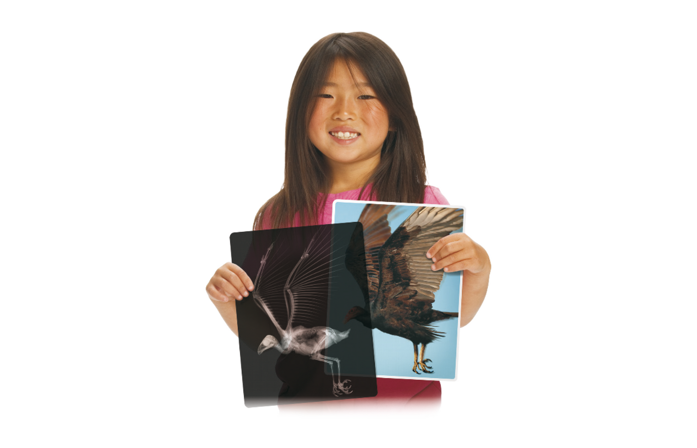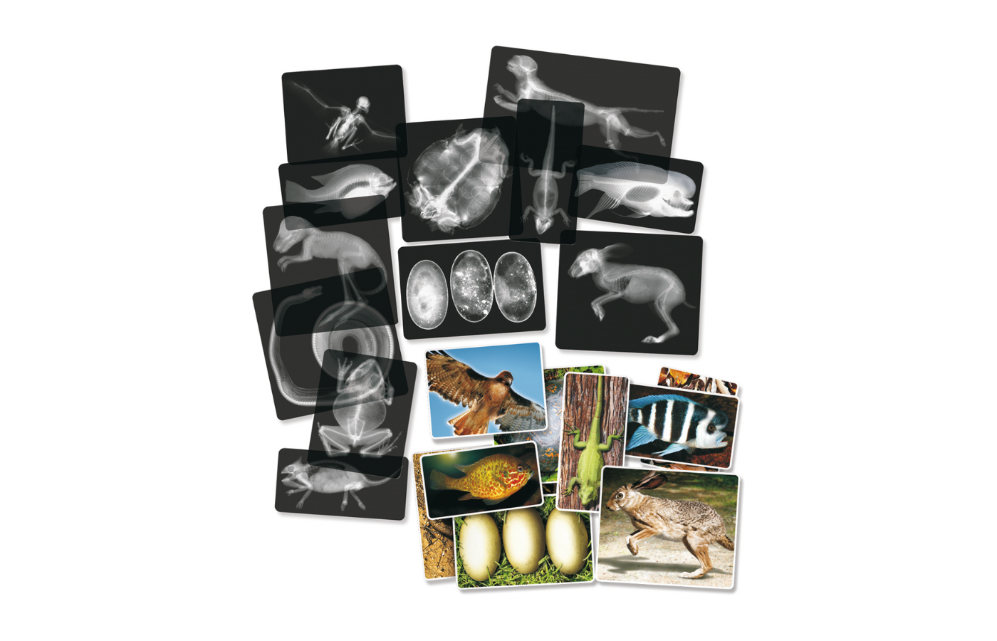 Introduce young children to paleontology with 14 beautiful discovery cards and corresponding x-rays. Place the x-rays over the picture cards to examine the bodies from the inside.
