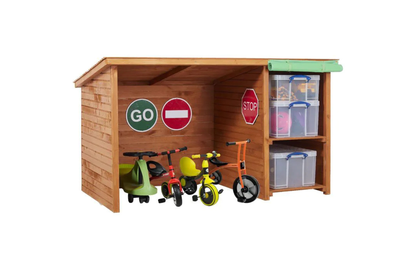 Meet this bike shed with storage, the perfect solution for organizing your outdoor play space. This weatherproof shelter keeps bikes and trikes dry, organized and ready to go. Easy to assemble, it features dedicated storage and built-in shelves.