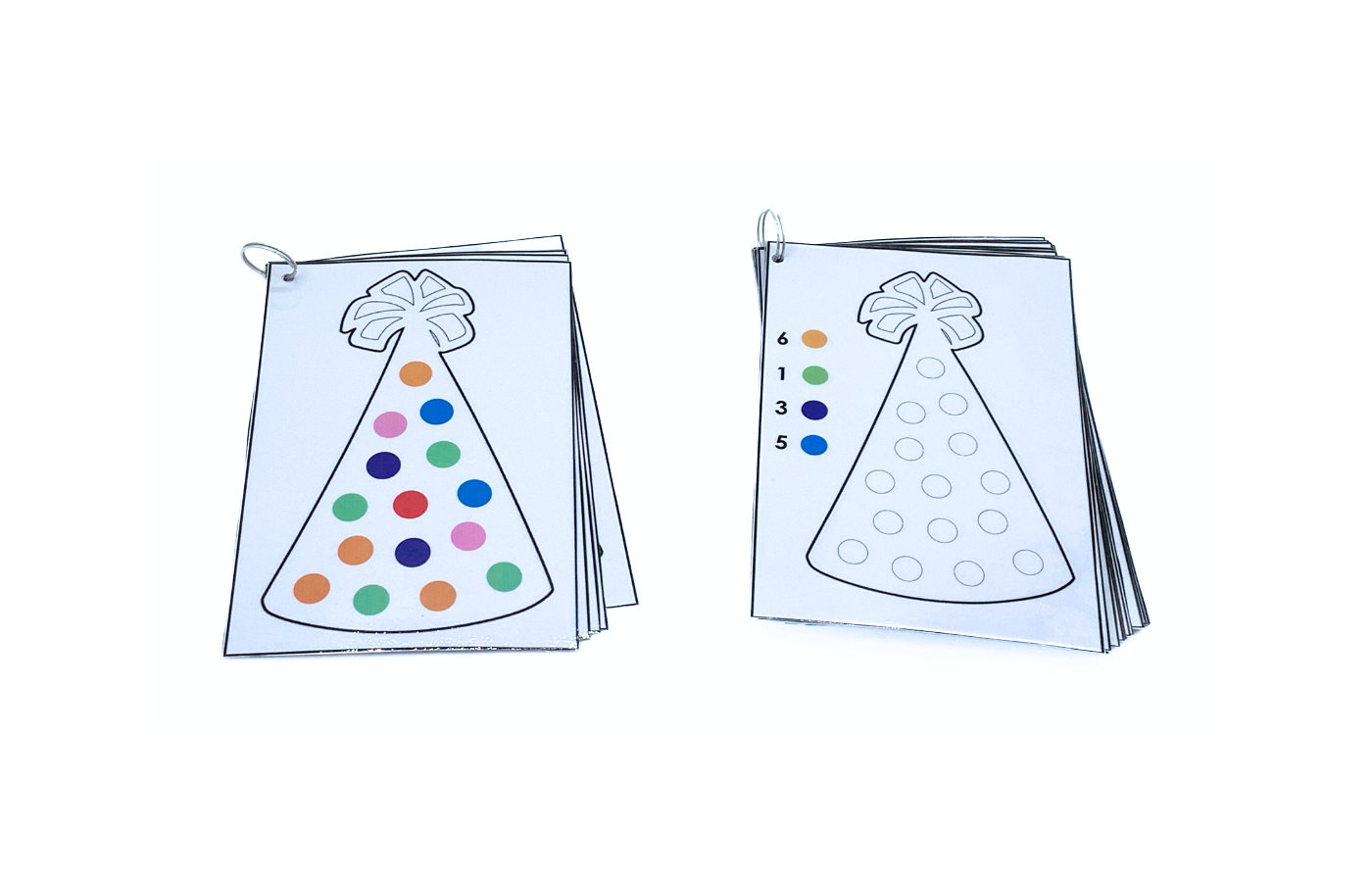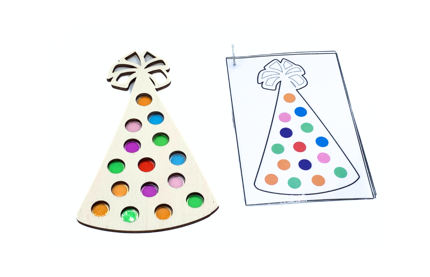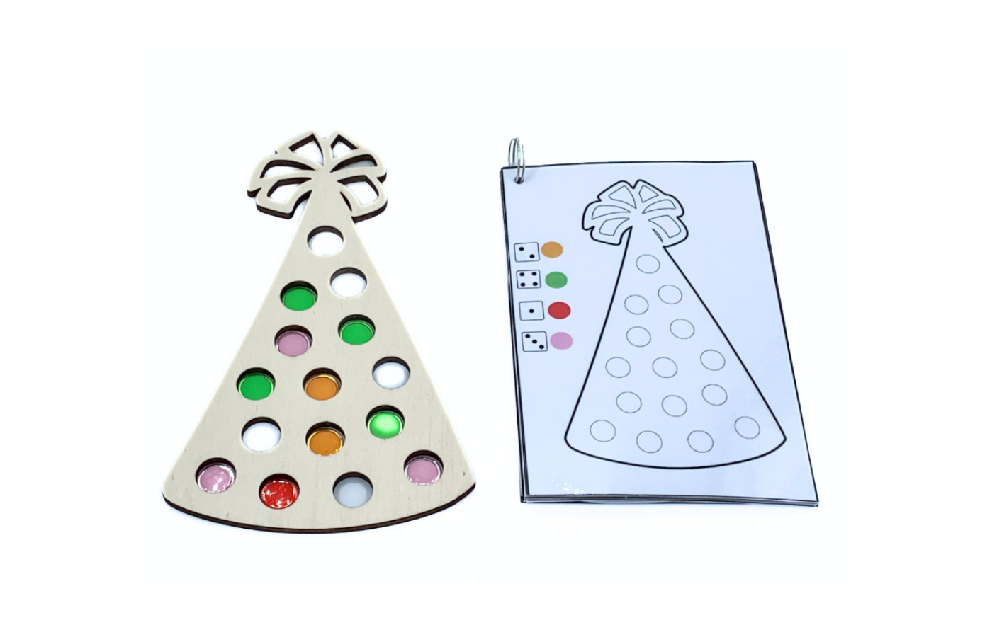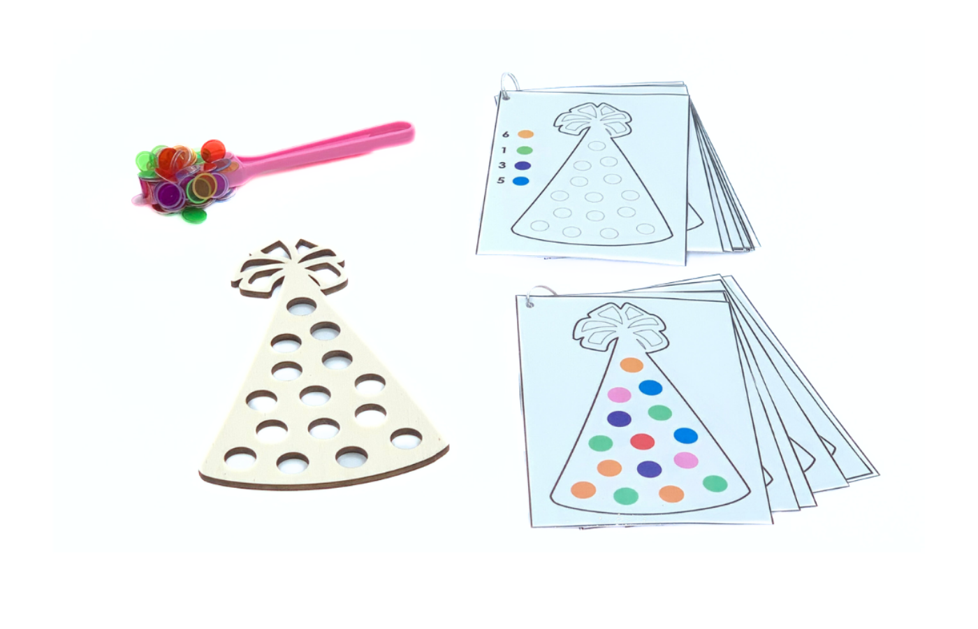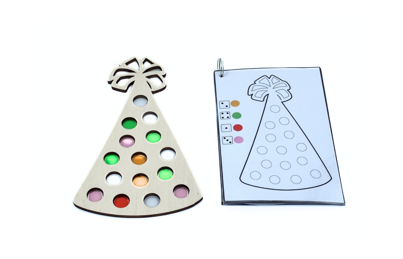 Fine motor game related to spatial orientation and arithmetic. The children decorate the party hat. This game board can be used in the domains of spatial orientation and arithmetic. Differentiation is integrated into the 30 assignment cards.