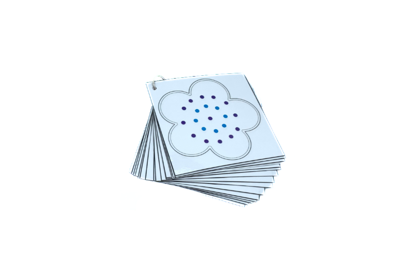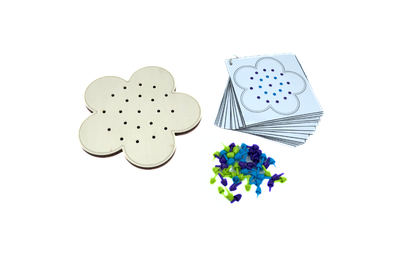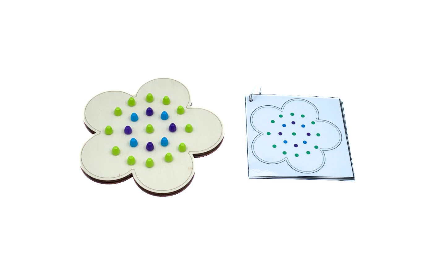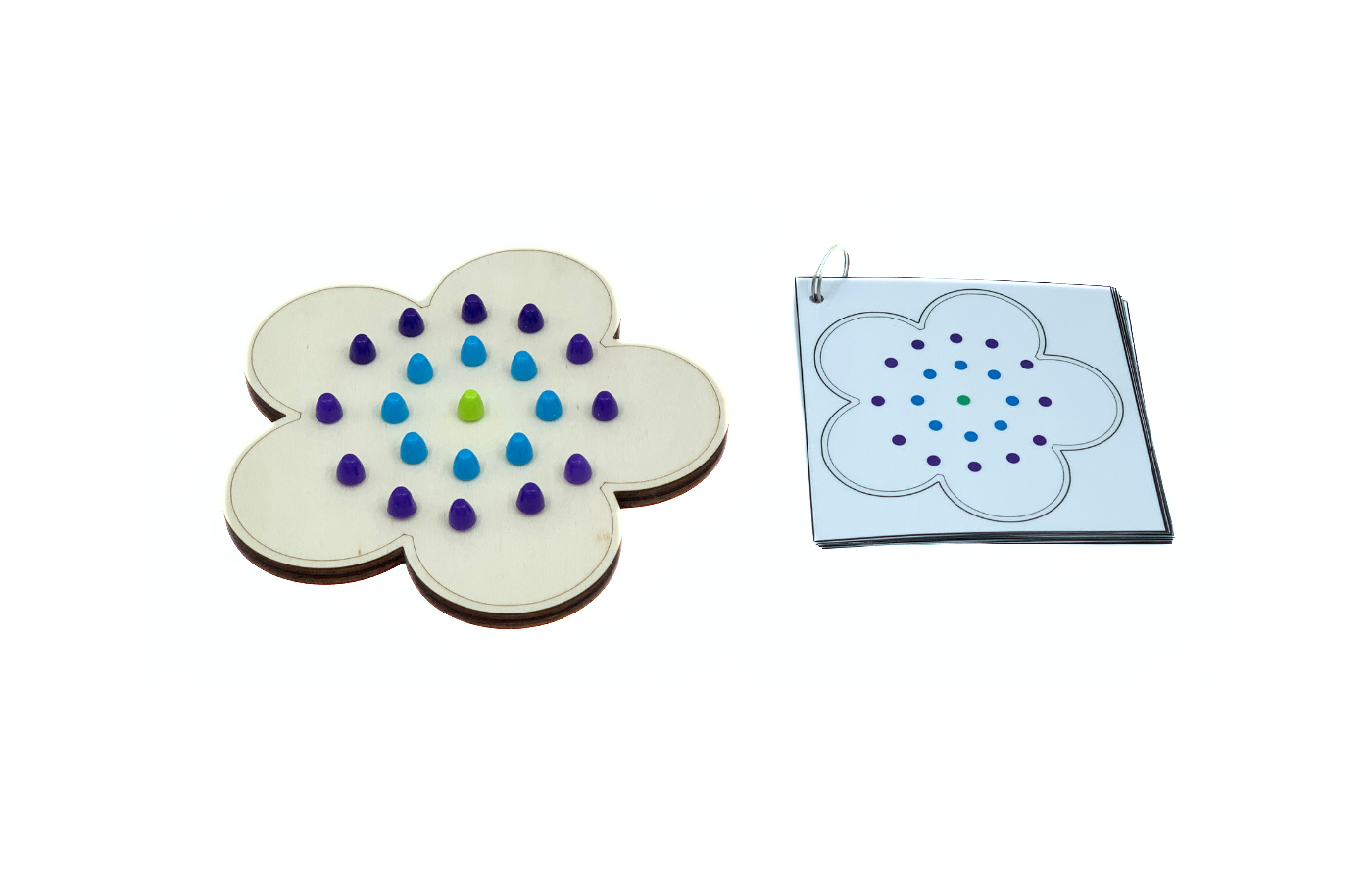Give the flower back its beautiful colors! Game related to spatial orientation and fine motor skills. The children arrange the colored beads on the flower based on assignment cards. Differentiation has been incorporated into the 16 assignment cards. (print and laminate yourself). Making a free creation is of course also possible. Includes 45 colored pearls (purple, blue and green).