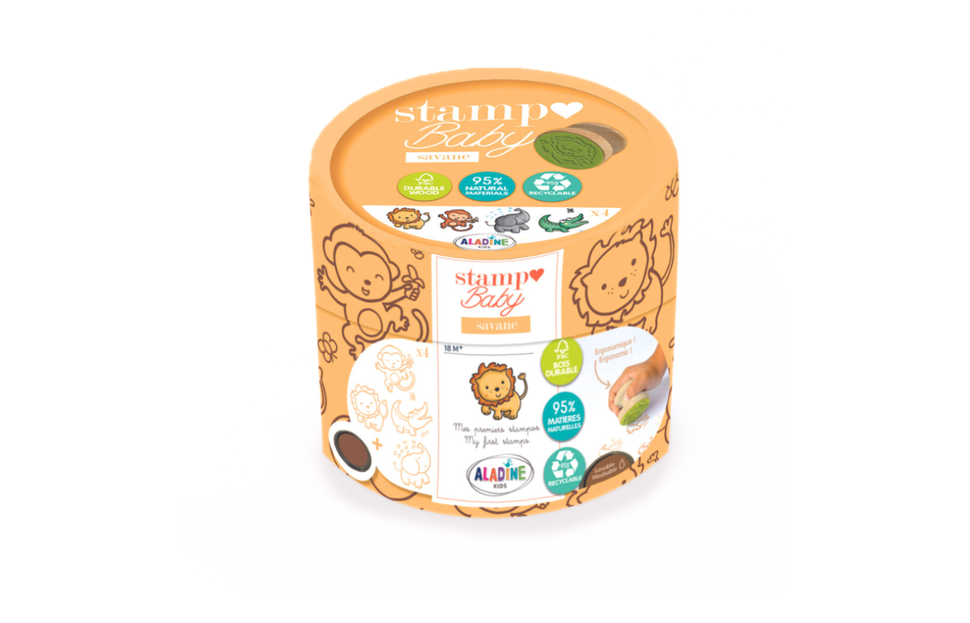 Set of 4 ergonomic wooden stamps in the theme of wild animals, suitable for the hands of children from 18 months. The FSC wood comes from sustainably managed forests. The packaging also contains an ink pad that meets current standards for children.