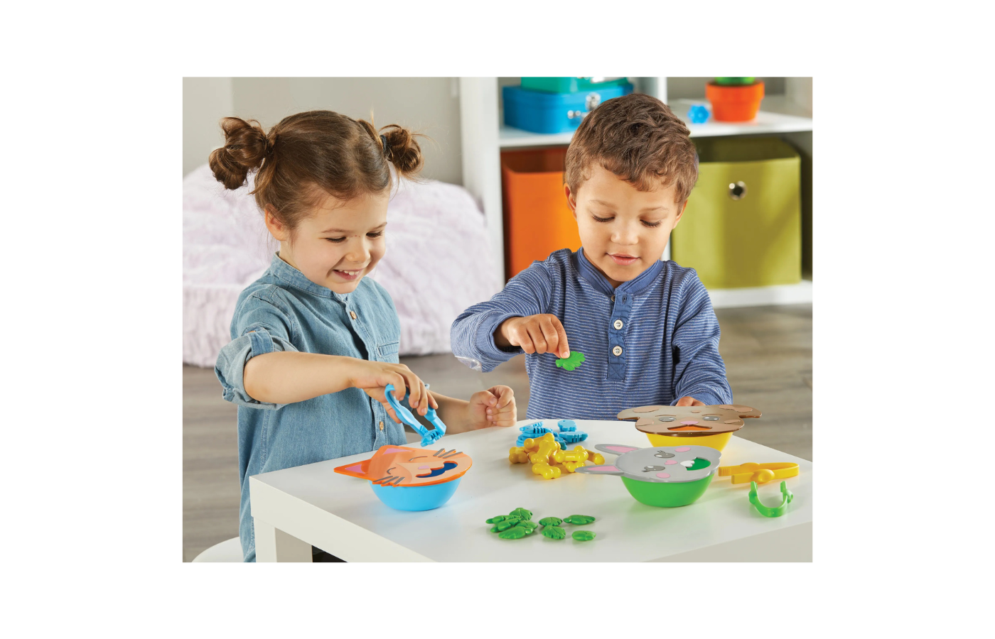 These adorable animals are hungry!! Kids grab their tweezers, pick up a piece of their favorite candy, and feed it to their new friend. With three levels, it's a delicious way to build hand strength, coordination, and more. Includes 3 tweezers and 30 counting candies.