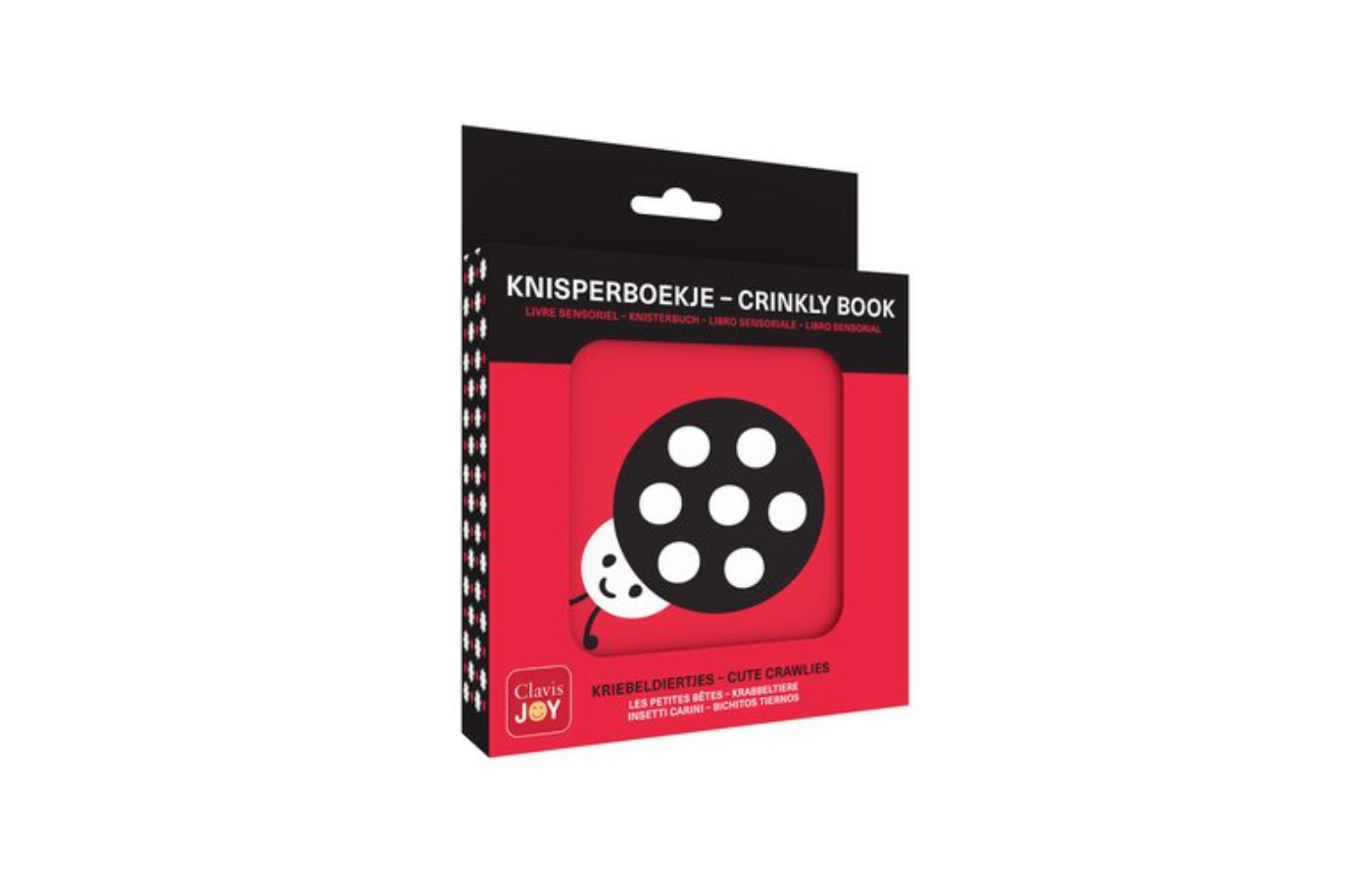 Een knisperboekje in thema kriebeldieren, in zwart-wit, met vrolijke kleuraccenten voor baby’s.
