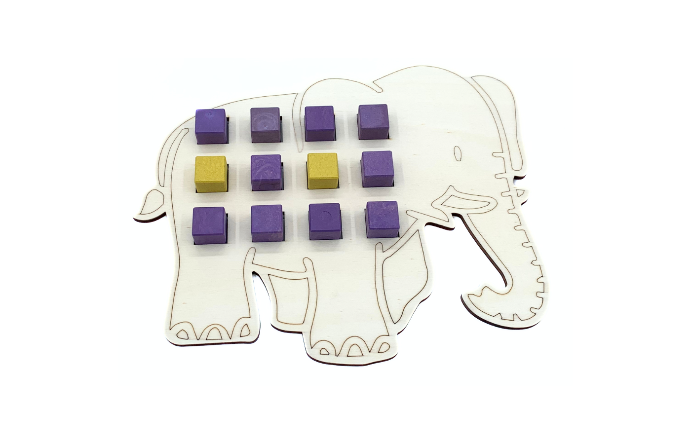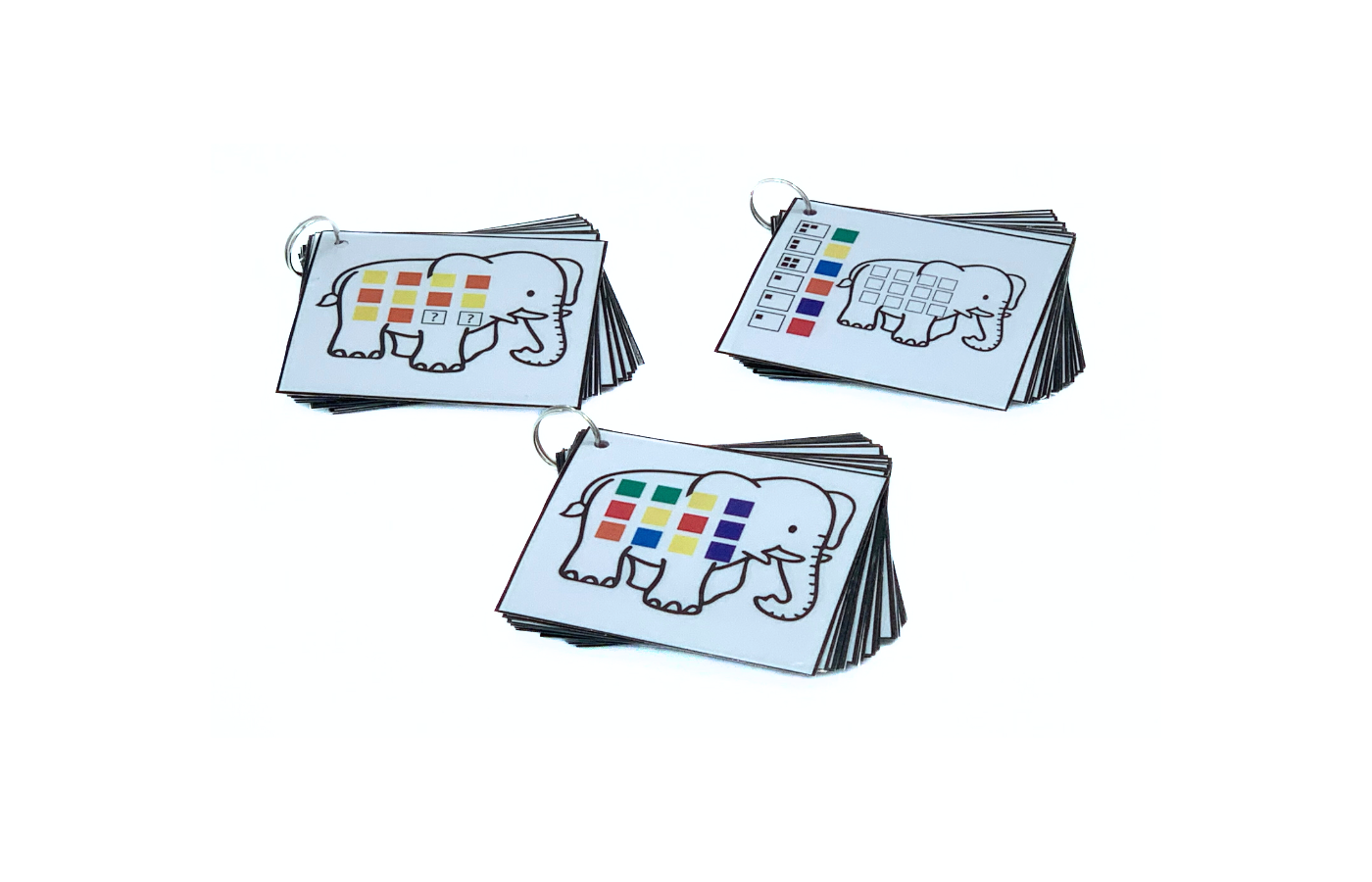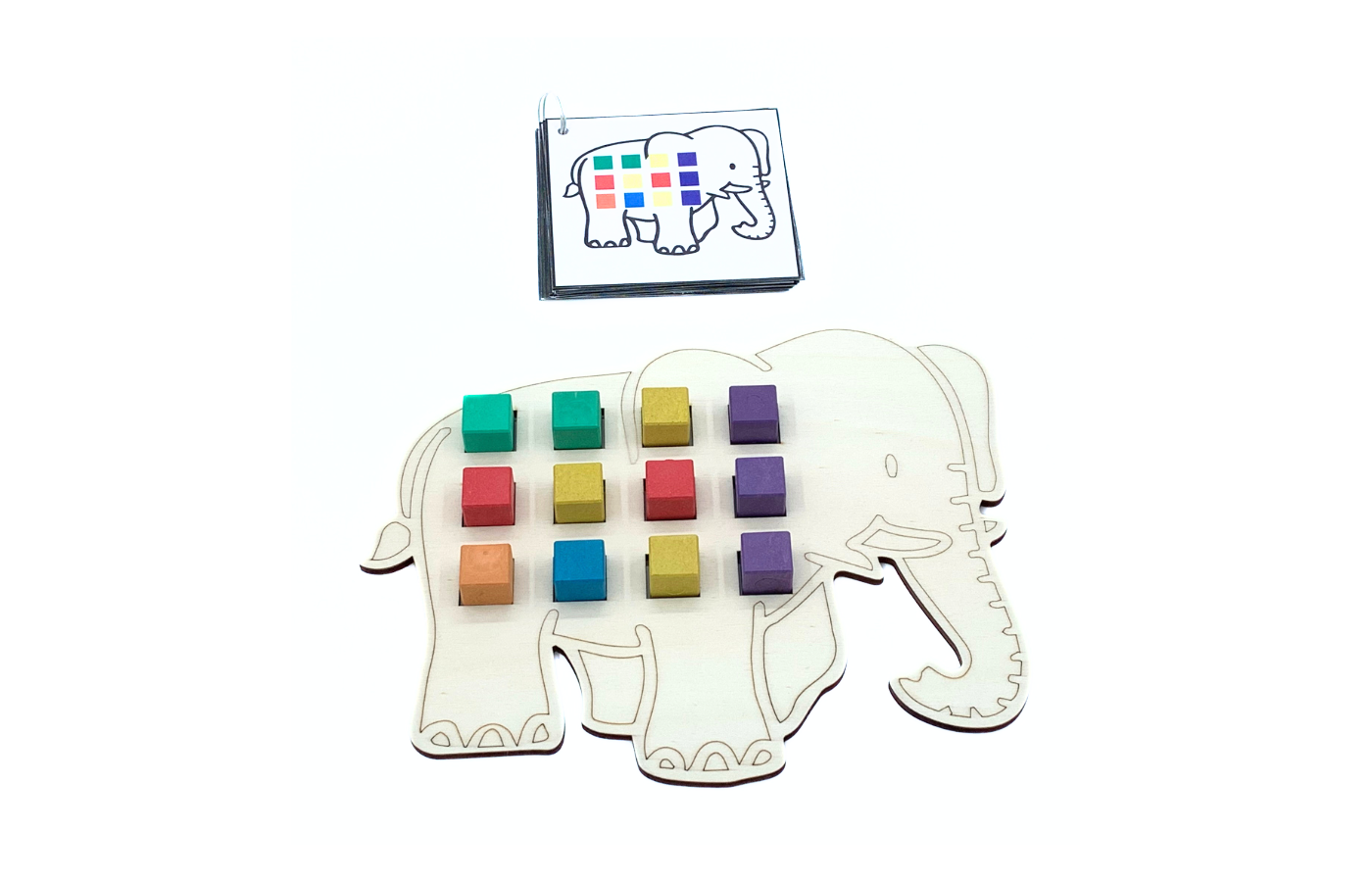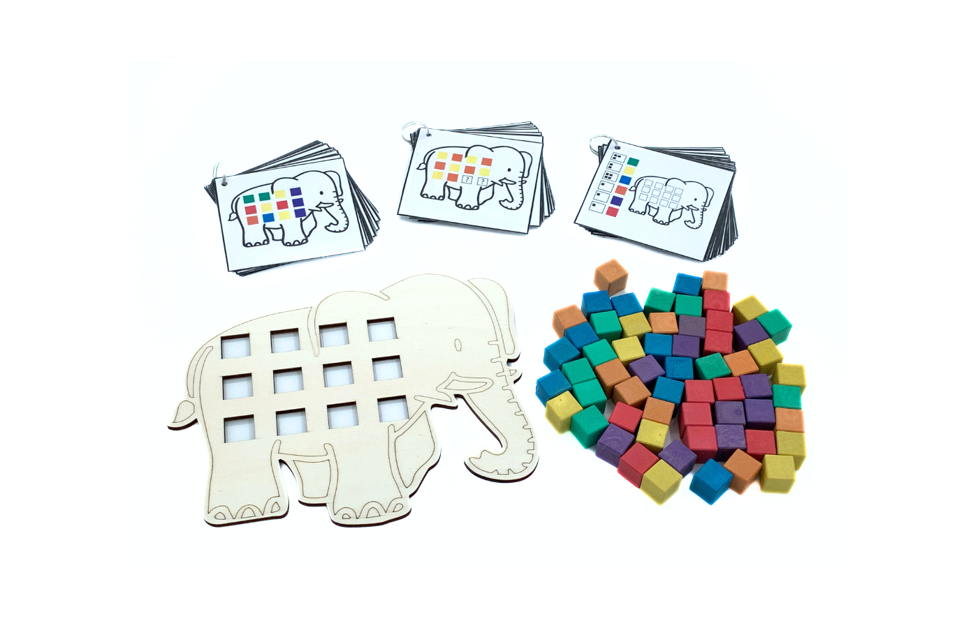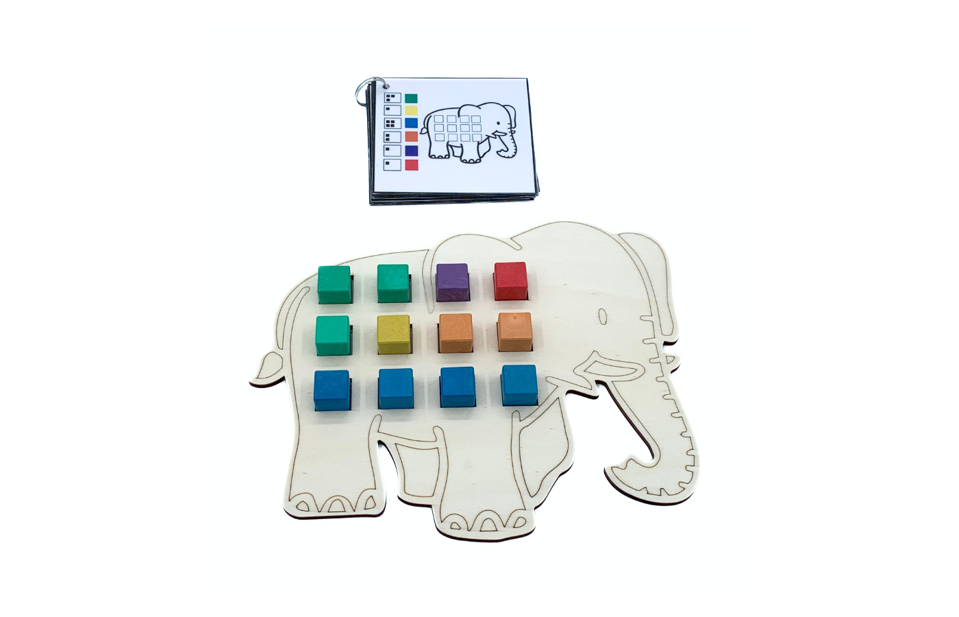 Game related to spatial orientation and arithmetic. The children arrange the colored blocks on the elephant. Differentiation is integrated into the 90 assignment cards. (print and laminate yourself). There are 3 versions of assignment cards (spatial orientation and arithmetic). Includes 60 colored blocks (red, yellow, green, blue, orange and purple).