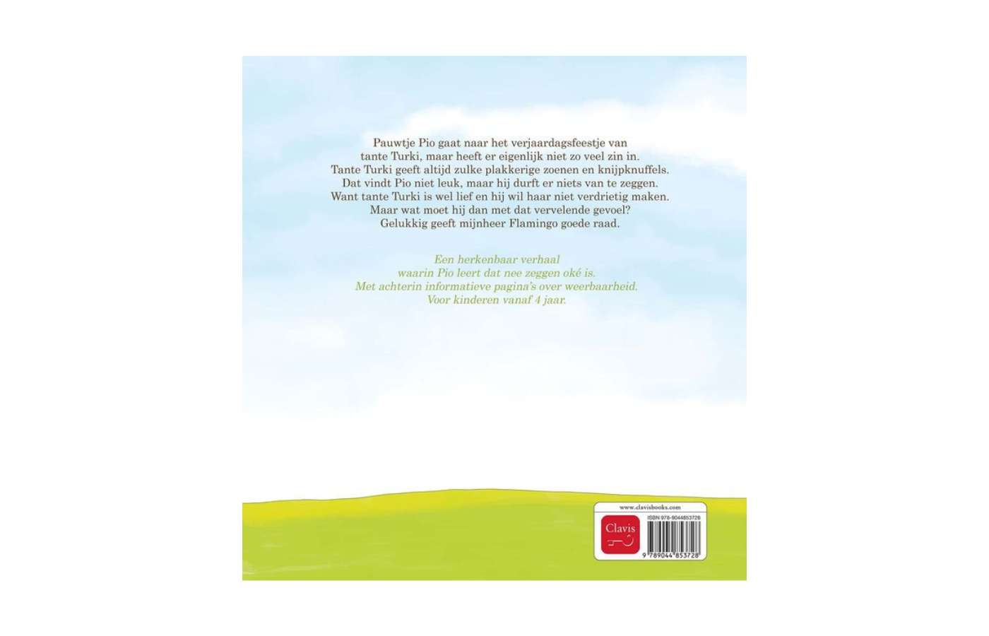 Peacock Pio goes to Aunt Turki's birthday party, but he doesn't really feel like it. Aunt Turki always gives such sticky kisses and squeezes. Pio doesn't like that, but he doesn't dare say anything about it. Because Aunt Turki is sweet and he doesn't want to make her sad. But what should he do with that annoying feeling? Fortunately, Mr. Flamingo gives good advice.