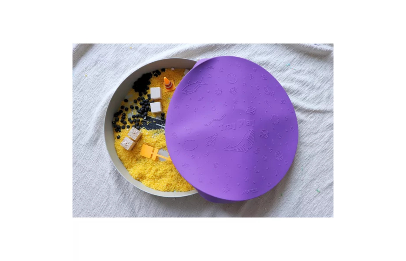 This play tray is a 2-in-1 sensory tray that lets you create a mini world within the tray and the silicone lid. The silicone lid is decorated with beautiful textured illustrations of nature, space, and garden creatures.