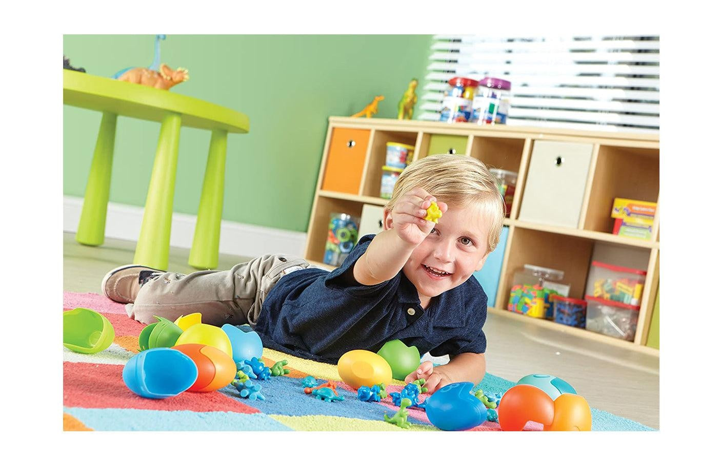 Avec ce set de comptage et de tri de dinosaures, les enfants peuvent apprendre à compter et à reconnaître les couleurs de manière ludique. Les petits dinosaures sont cachés dans les œufs. Chaque œuf numéroté et coloré contient un nombre correspondant de dinosaures de la même couleur que l'œuf. Différentes compétences peuvent être exercées telles que le comptage, le tri, la création de motifs, l'addition, la soustraction, le développement du langage, la motricité fine et la coordination œil-main.