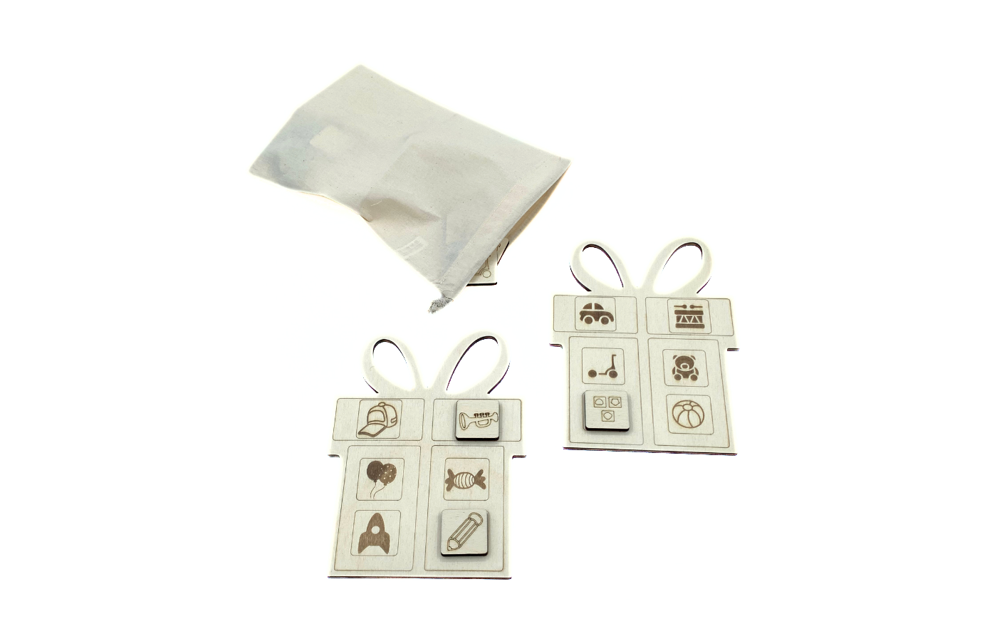 Mettez tous les petits cartons en bois dans un sac en coton et tirez un cadeau un par un. Avez-vous le cadeau sur votre carte de bingo ? Alors vous pouvez le mettre (à l'envers) sur votre carte de bingo.