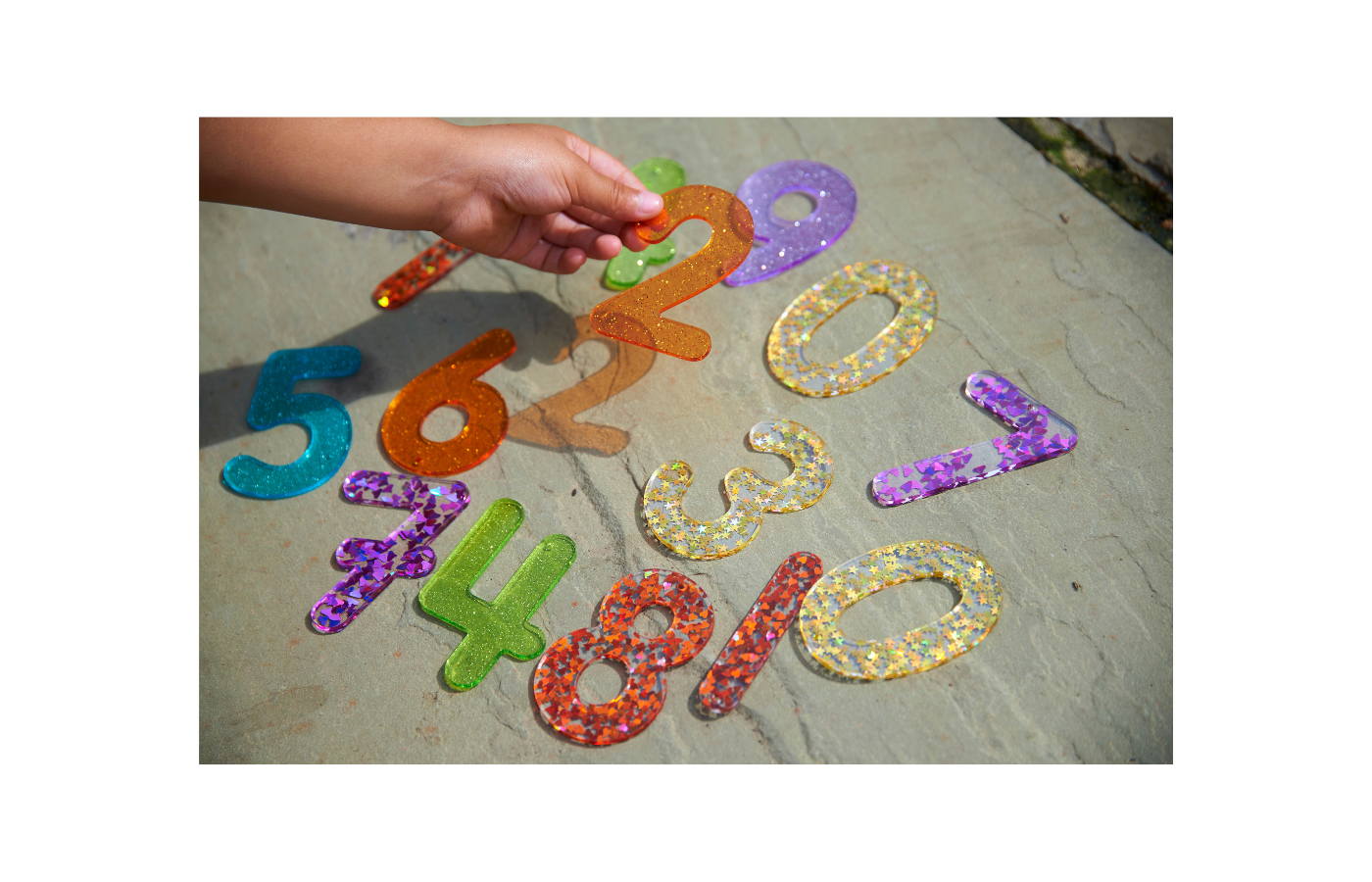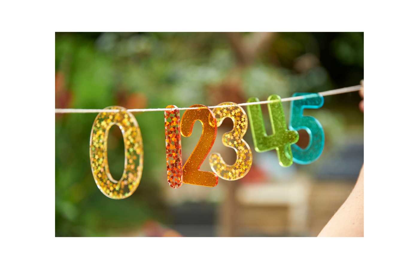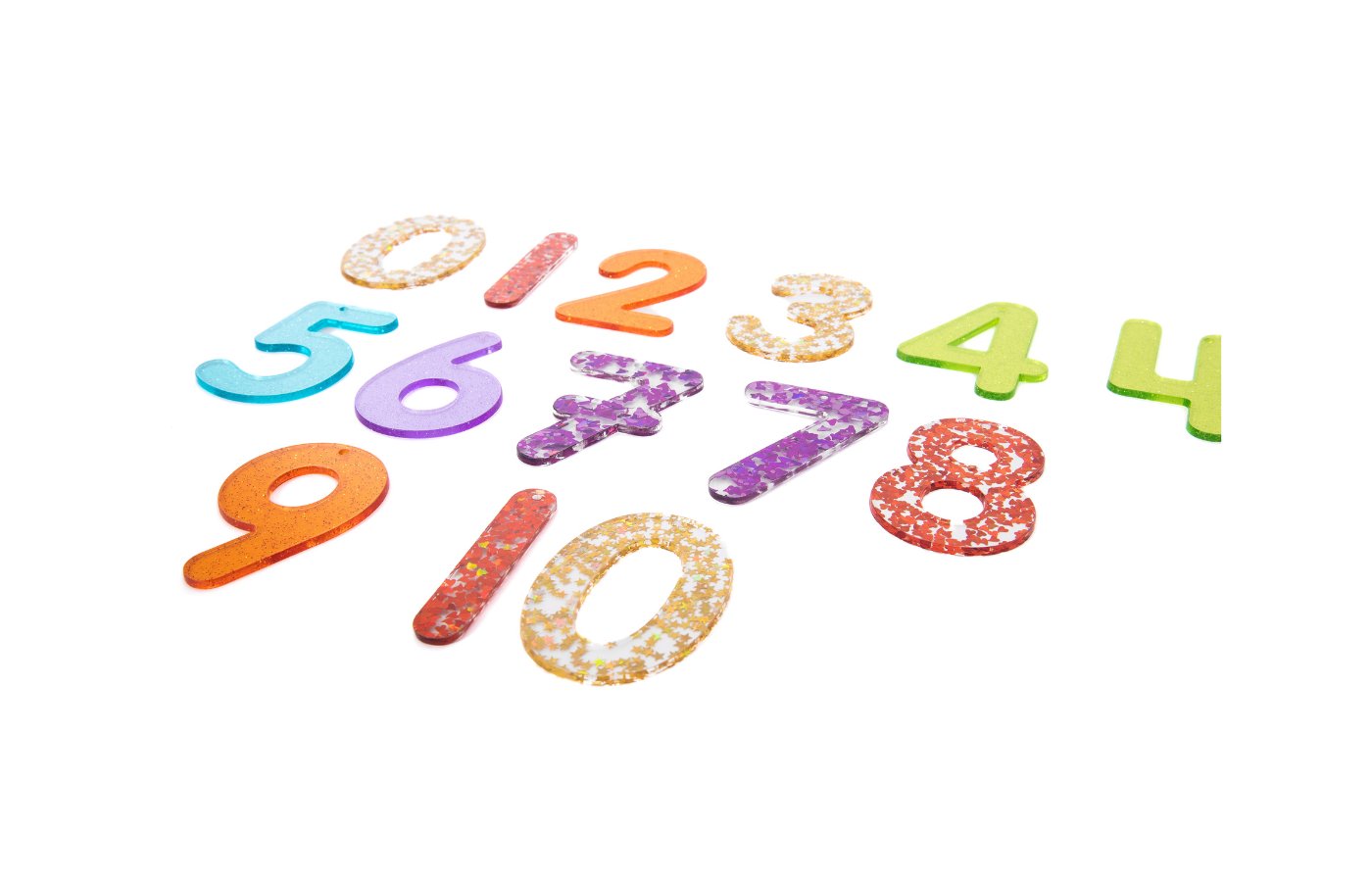 Un ensemble de 14 chiffres scintillants en paillettes fabriqués en acrylique coloré et translucide. L'ensemble comprend deux variantes des chiffres 4 et 7. Un chiffre supplémentaire 0 et 1 a également été ajouté pour pouvoir former le chiffre 10. Ils sont idéaux pour une utilisation sur un panneau lumineux afin de favoriser la reconnaissance des chiffres. Ils sont dotés d'un trou de 2,5 mm au point d'équilibre supérieur, ce qui permet de les suspendre contre une fenêtre ou à l'extérieur pour créer des ombres colorées et scintillantes fascinantes.