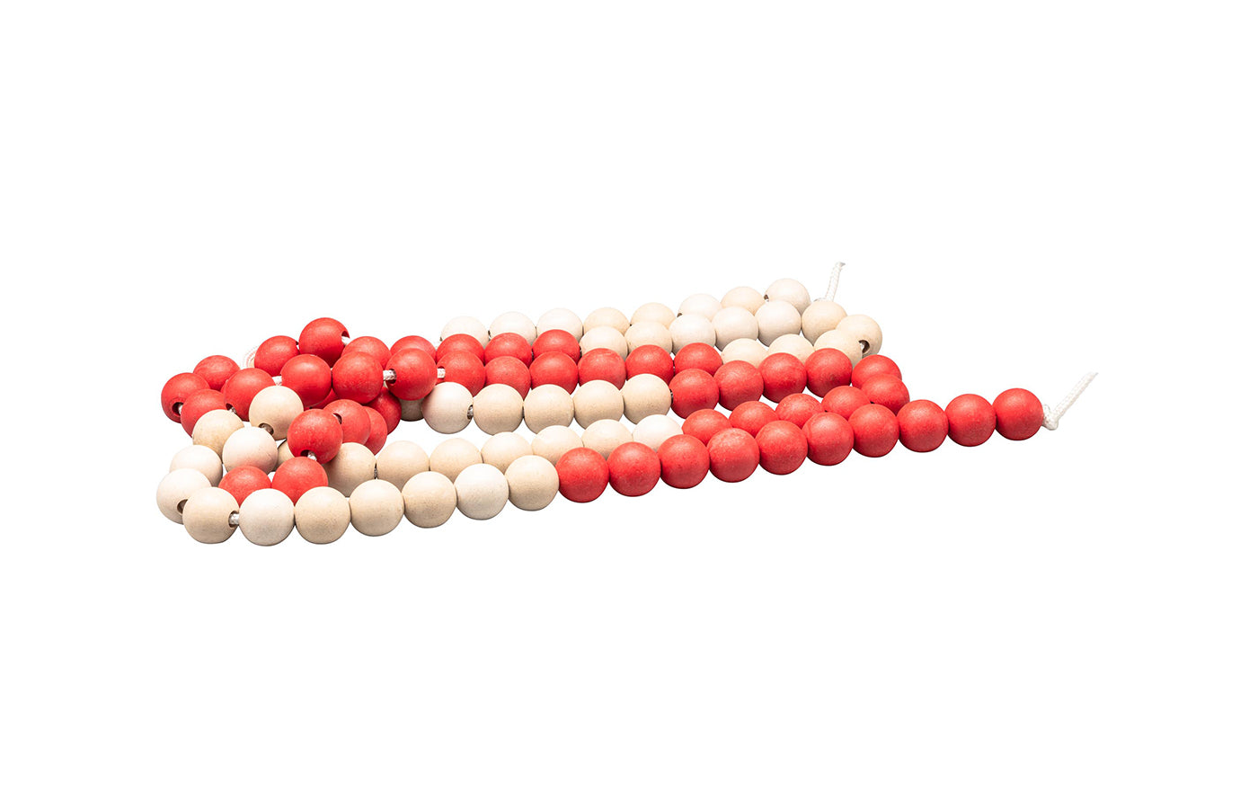 Billes de calcul pour effectuer des exercices de calcul (préparatoires). Les billes de calcul ont une structure de 5 (rouge / blanc). La corde mesure 300 cm de long et les billes elles-mêmes mesurent 2,5 cm.