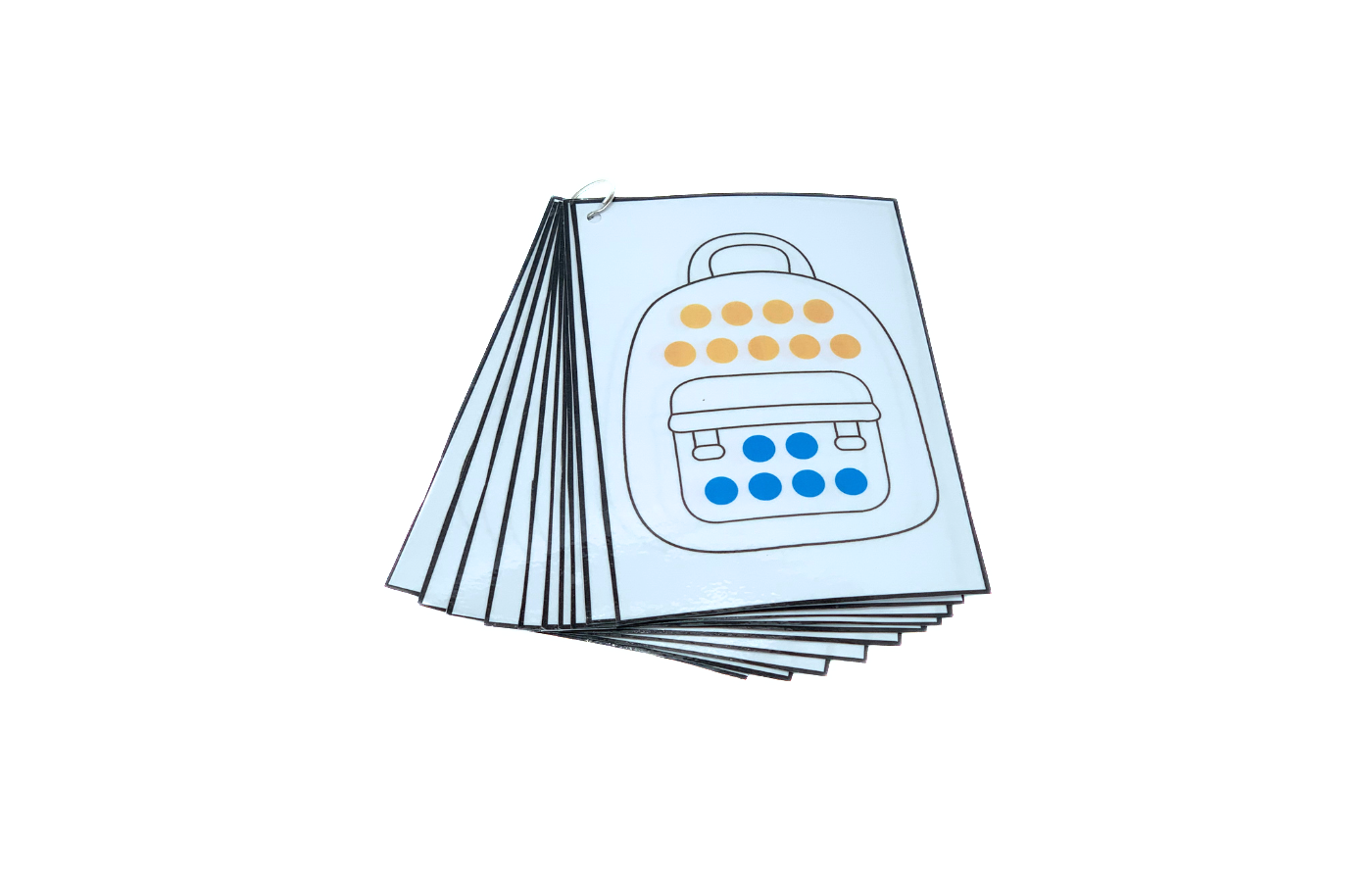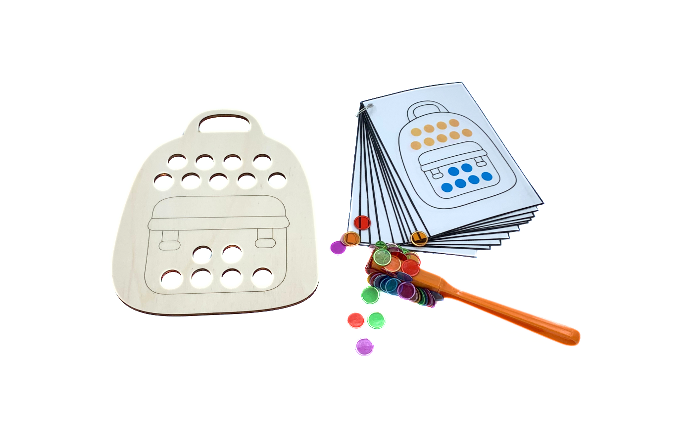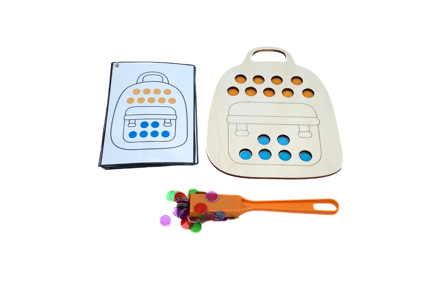 Jeu de motricité fine lié à l'orientation spatiale. Les enfants placent les jetons magnétiques dans les trous du sac à dos en fonction d'une carte de mission. Avec la tige magnétique, les enfants peuvent retirer les jetons du plateau de jeu de manière ludique.