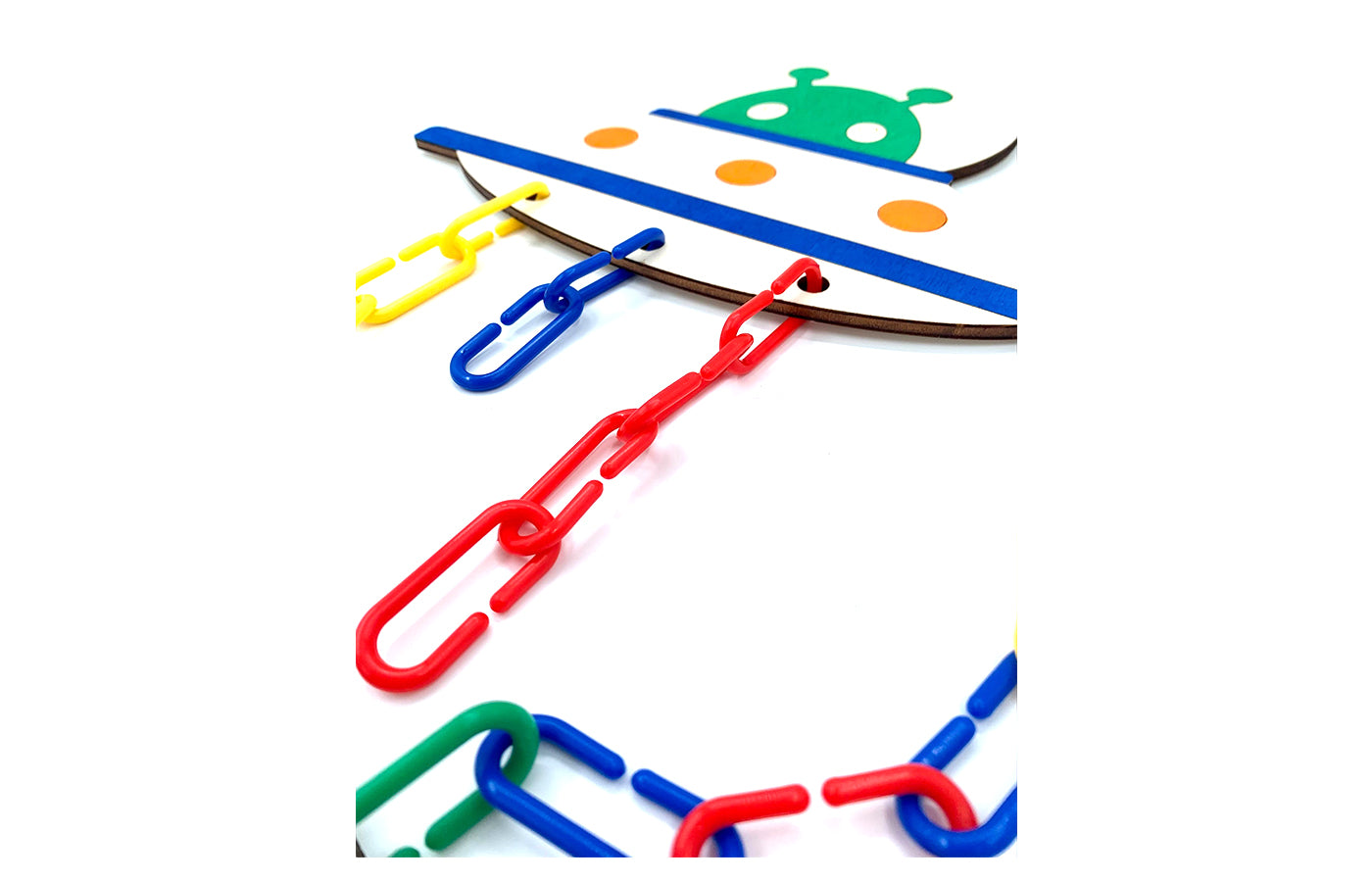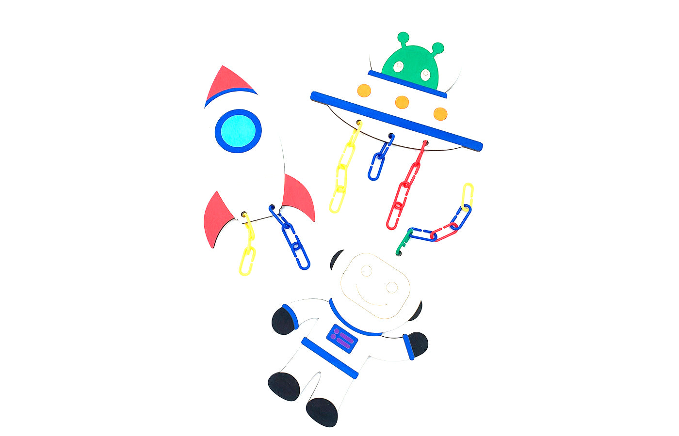 Jeu de motricité fine en rapport avec l'orientation spatiale. Les enfants activent les liens sur les différents tableaux de jeu sur le thème de l'espace. Le feu de la fusée, l'antenne de l'astronaute et les signaux de l'OVNI. Les liens de couleur sont très adaptés à cette activité. Ces tableaux de jeu peuvent être achetés en version naturelle et colorée.