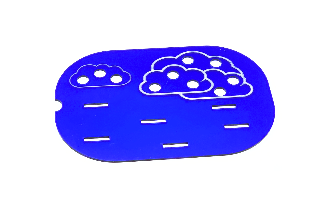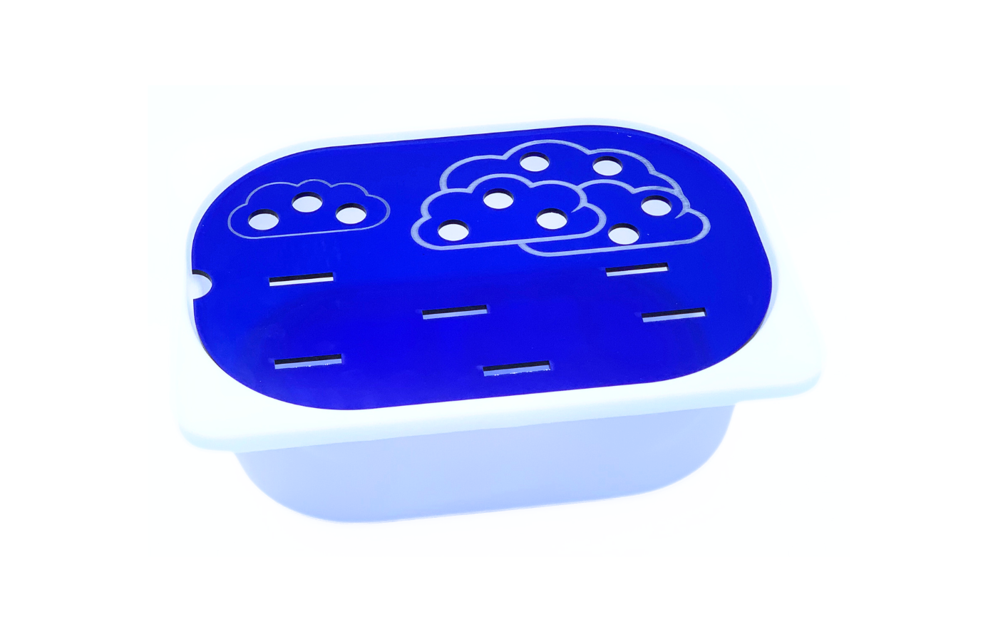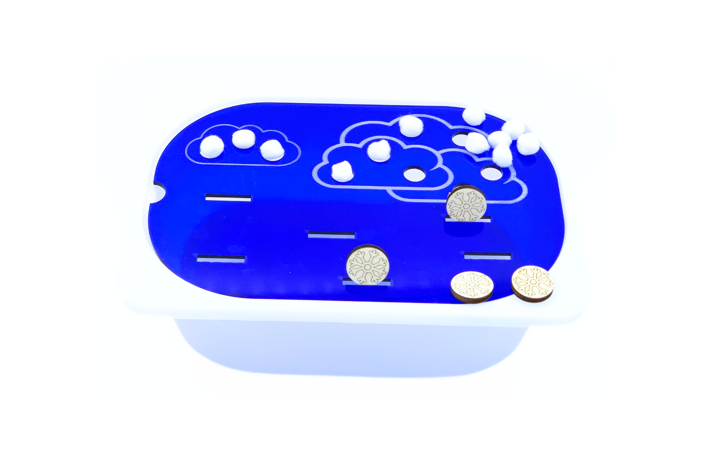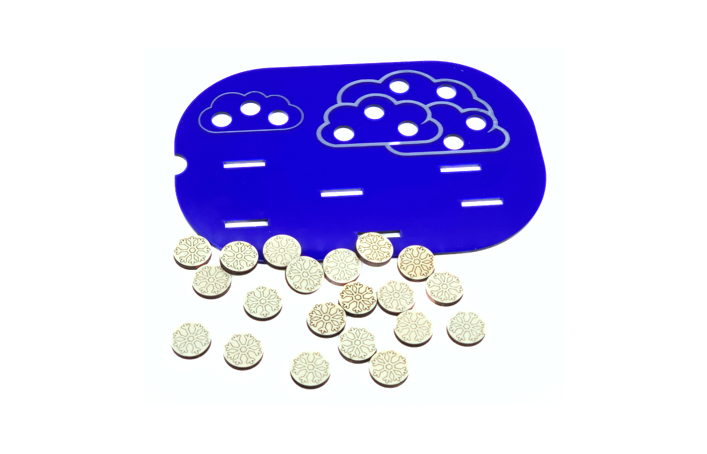 Couvercle thématique (neige) en acrylique à utiliser sur les petits bacs Trofast connus d'Ikea. À combiner avec des pompons qui peuvent représenter de la neige. Stimulation des compétences motrices fines en plaçant les flocons de neige (pompons - formes en bois) dans les ouvertures.