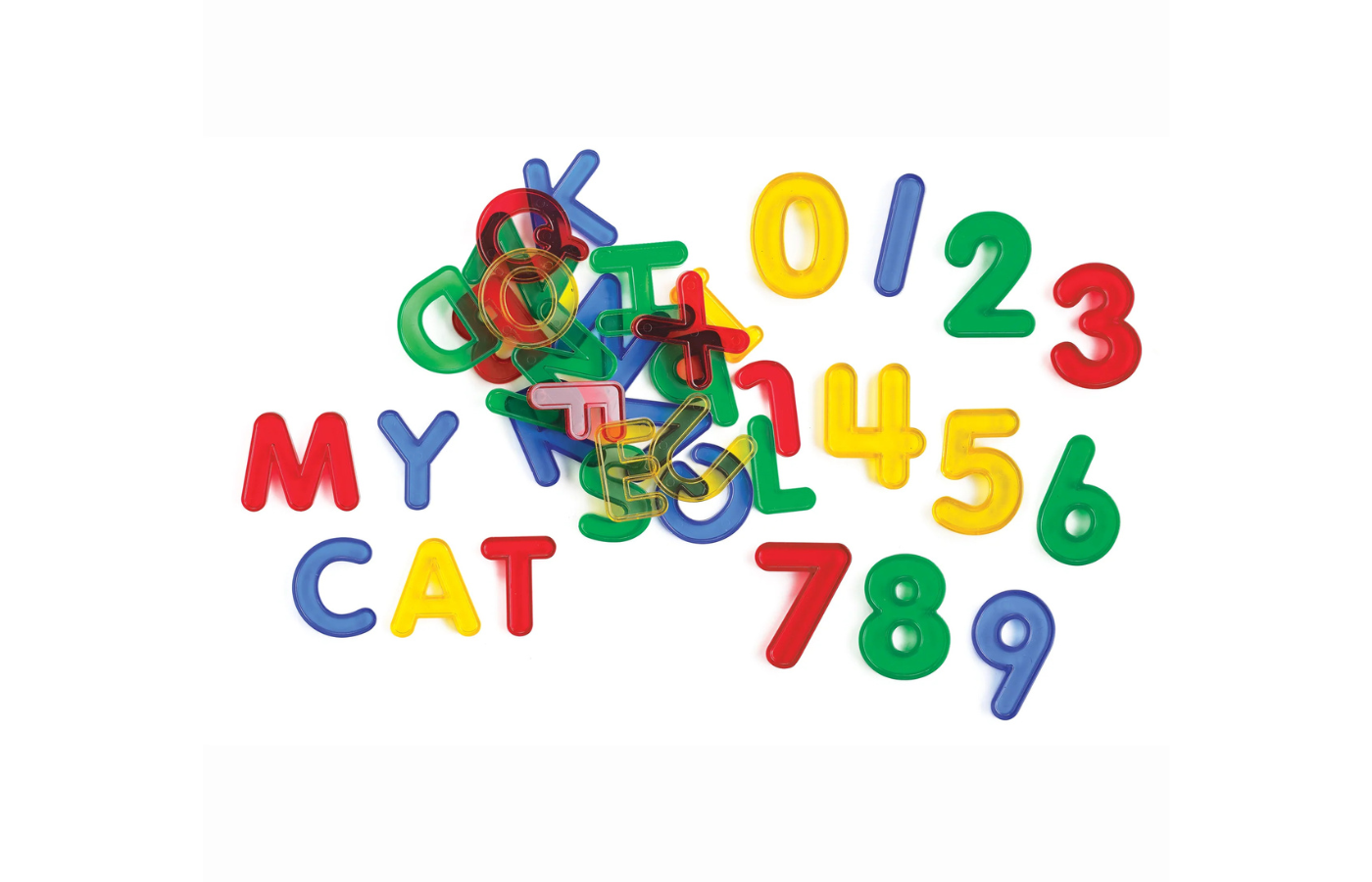 Lettres et chiffres en plastique transparent dans 4 couleurs vives et colorées. Idéal pour développer la reconnaissance des lettres et préparer les calculs. Également très adapté pour la table lumineuse.