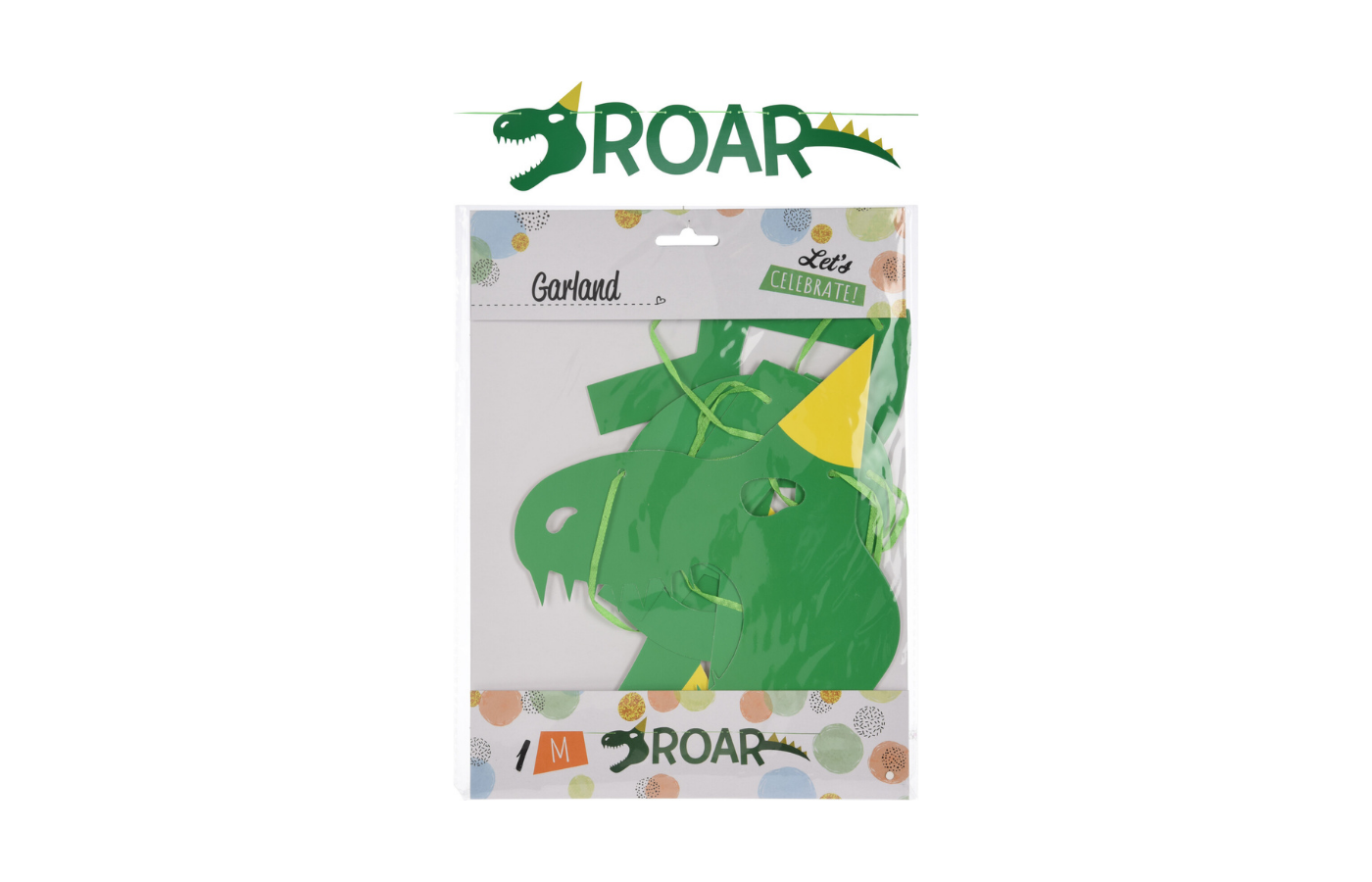Guirlande de drapeaux sur le thème des dinosaures avec l'inscription 'ROAR'. La longueur est de 100 cm.