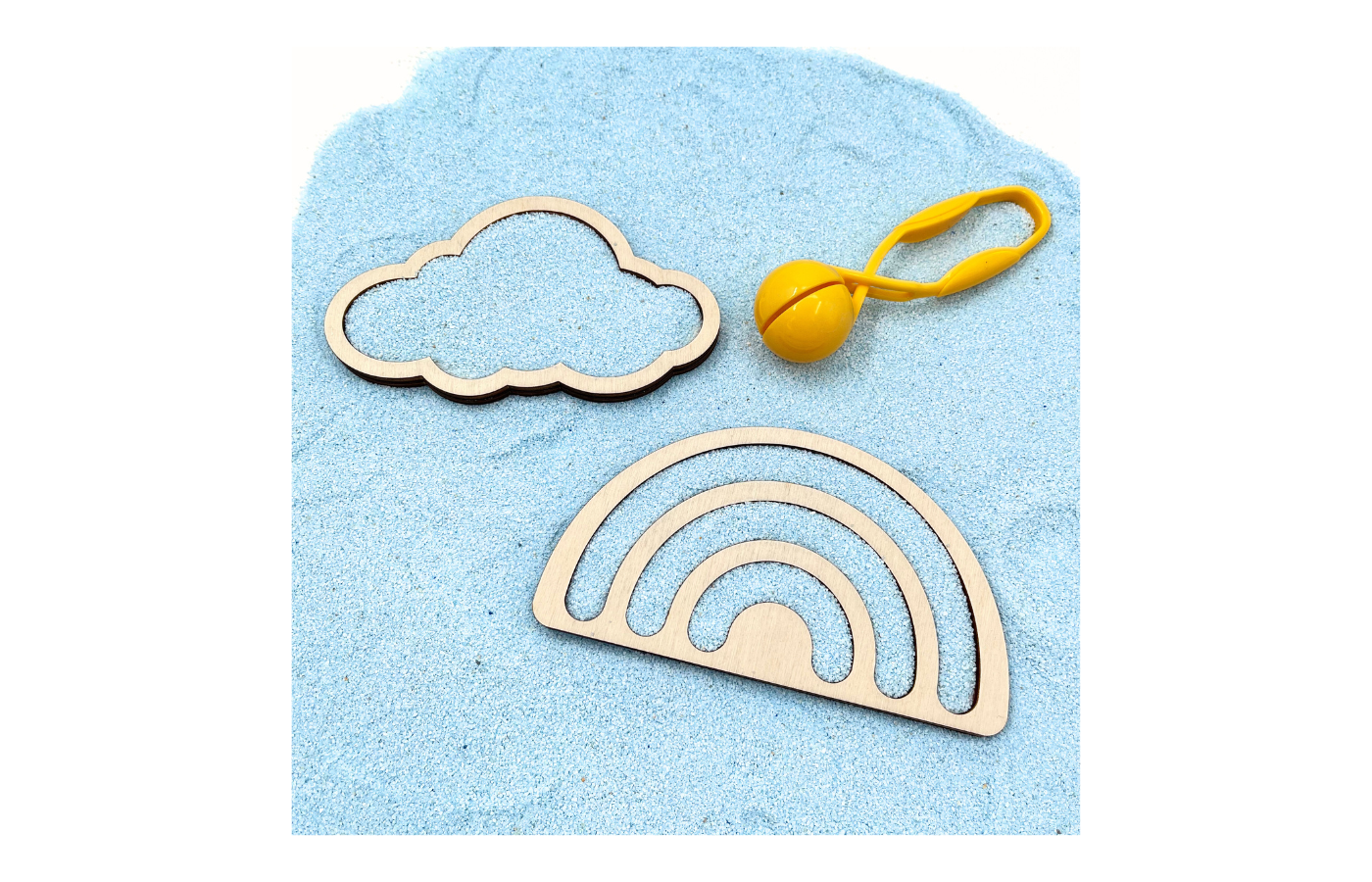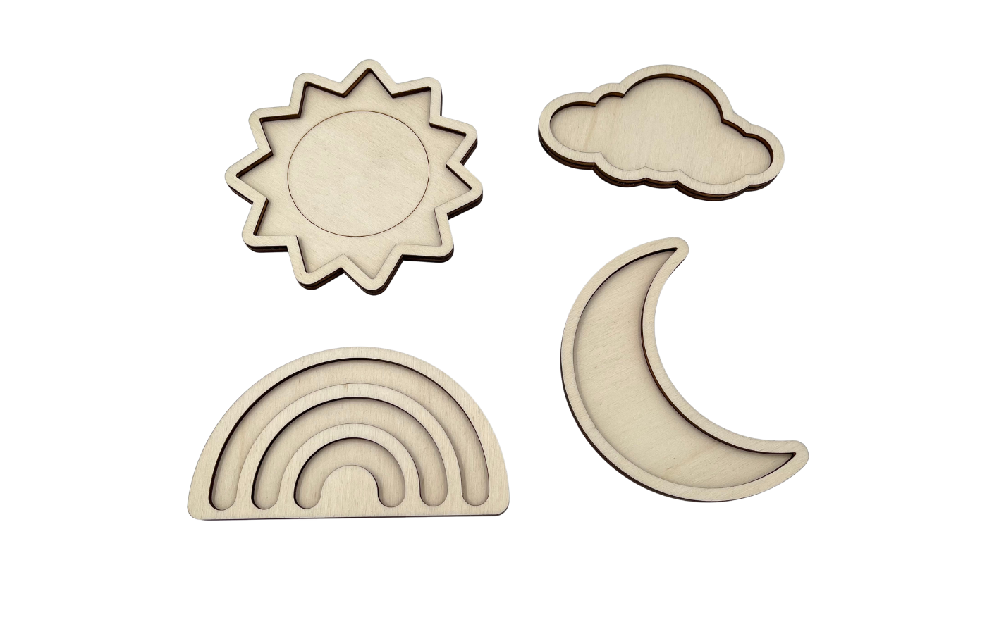 Formes de vulves ou plateaux de jeu sur le thème 'le temps'. Un soleil, un arc-en-ciel, une lune et un nuage. Parfait à remplir avec des matériaux secs tels que du riz à jouer, des pois chiches, du sable fin,... Dans un format mignon.