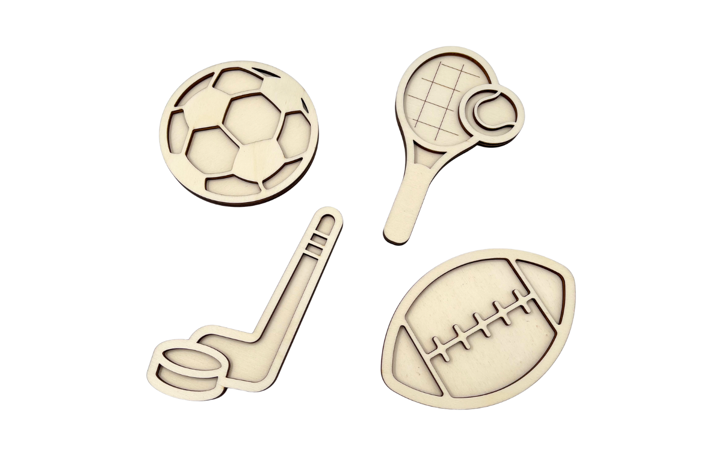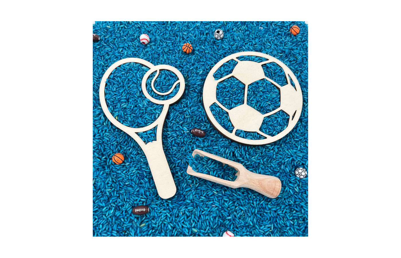 Plateaux de jeu ou formes ludiques sur le thème du sport. Un ballon de foot, une raquette de tennis, un ballon de rugby et une crosse de hockey. Parfaits pour y placer des matériaux secs comme du riz, des pois chiches, du sable fin, etc. Dans un format mignon.